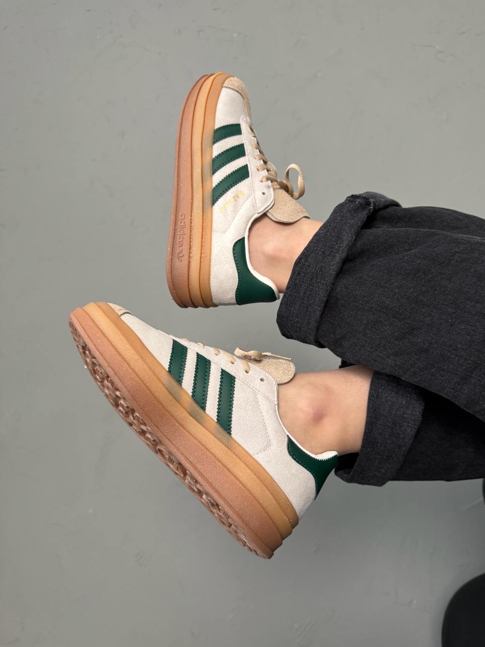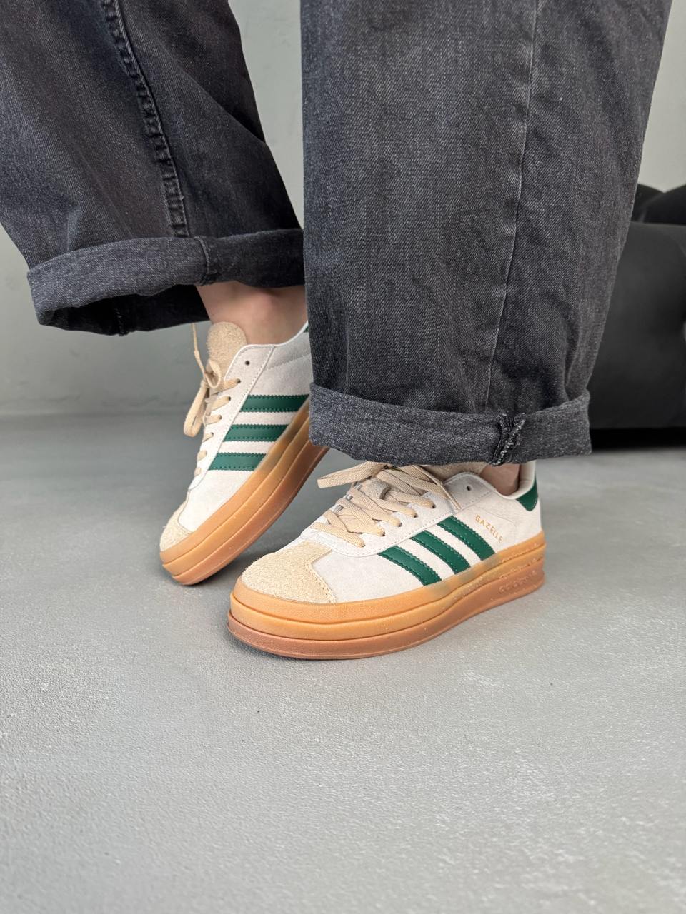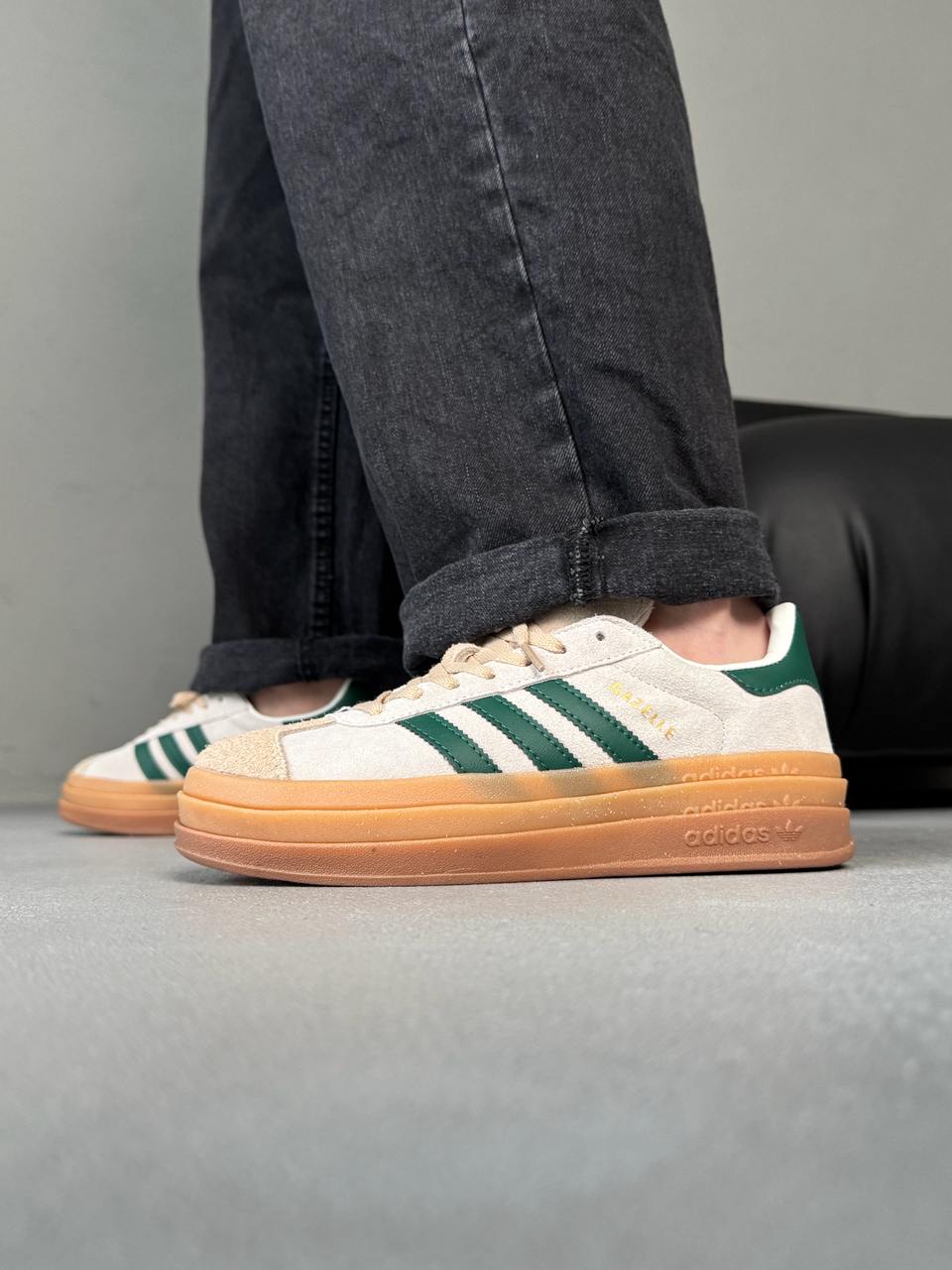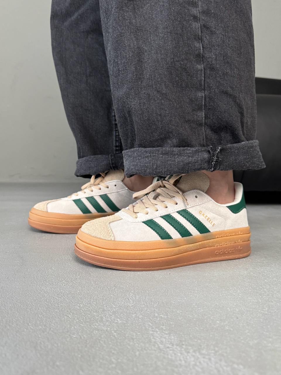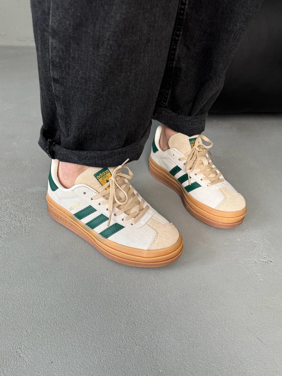 Adidas Gazelle Bold Cream Navi — це замшеві кросівки на платформі у ніжному кремово-синьому поєднанні, що поєднують ретро-стиль і сучасну елегантність.