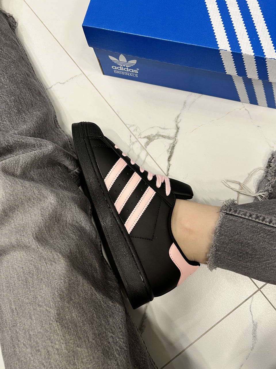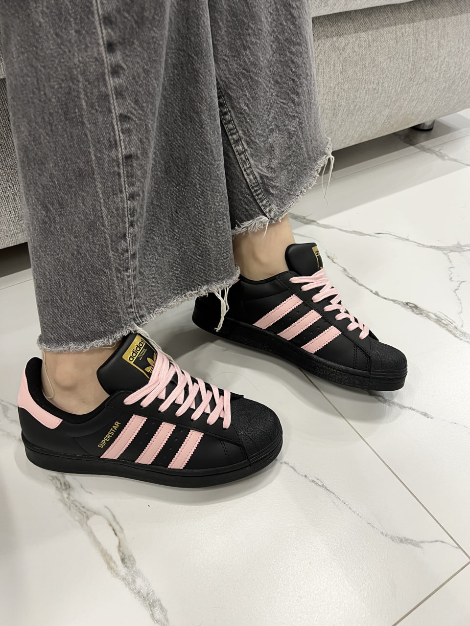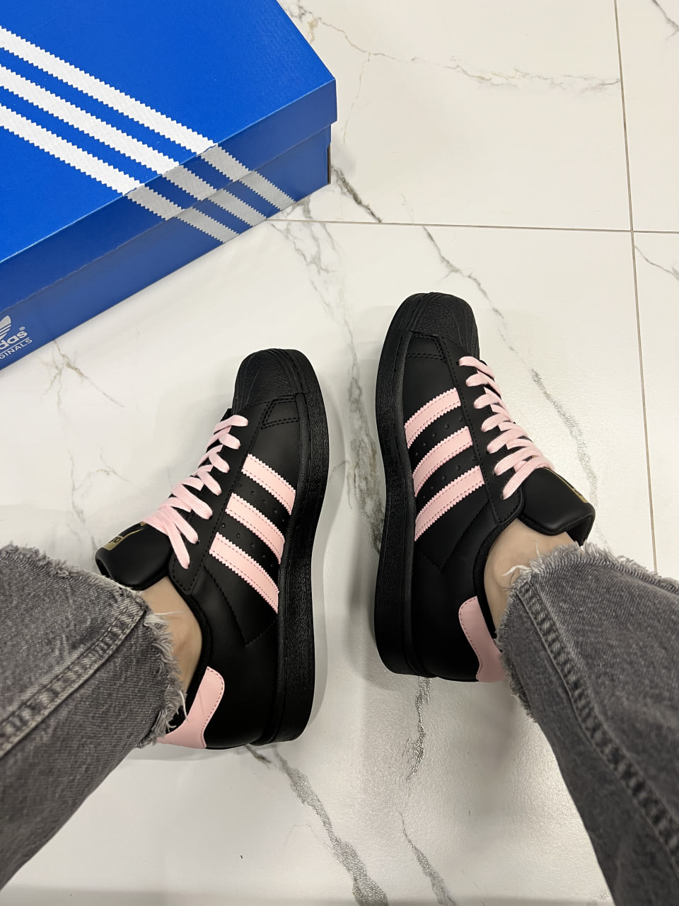 Adidas Superstar Smile Black Pink — стильні кросівки в чорному кольорі з акцентами рожевого. Верх із якісної шкіри, легендарна «черепашка» на носку та гумова підошва. Ідеально для міського стилю з ноткою жіночності.