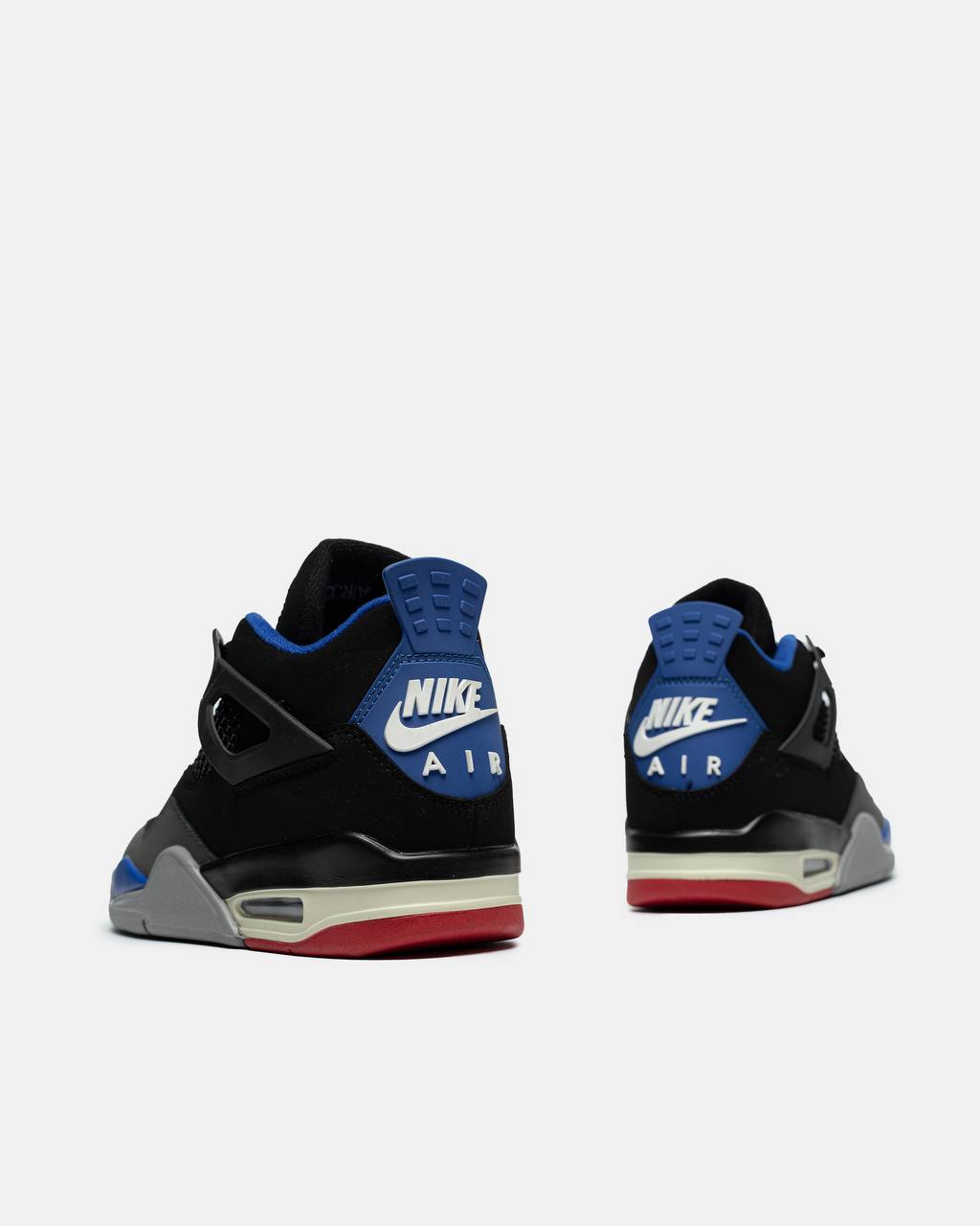 Air Jordan 4 Retro Rare Air — елегантні кросівки з чорного замшу з яскравими червоними та синіми акцентами і класичною підошвою з видимим Air-блоком.