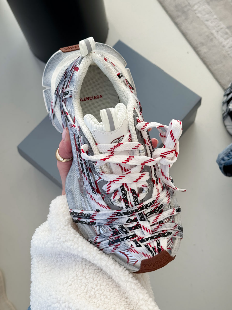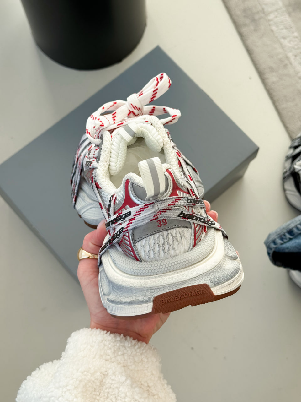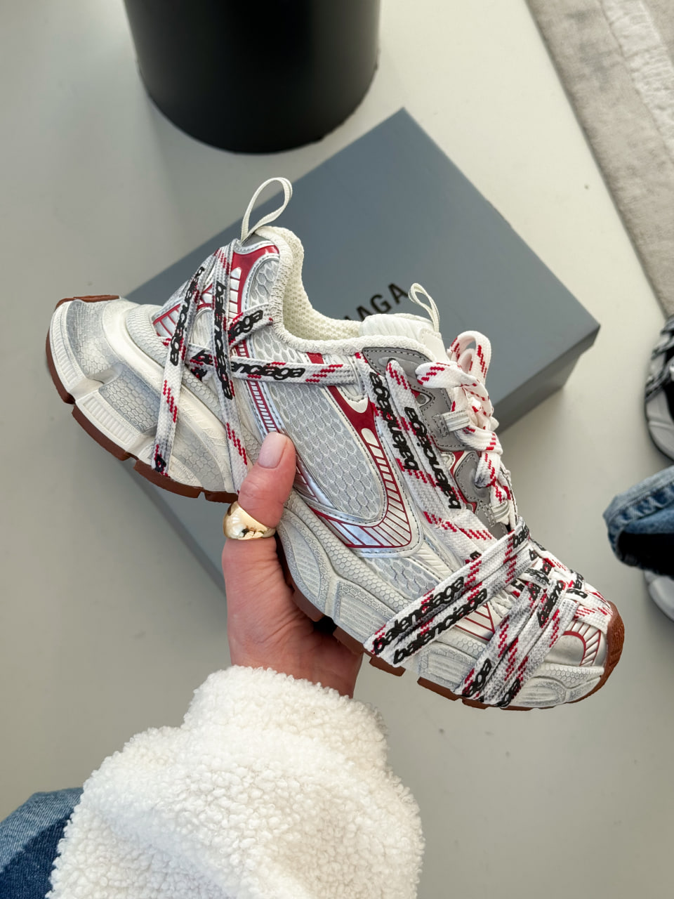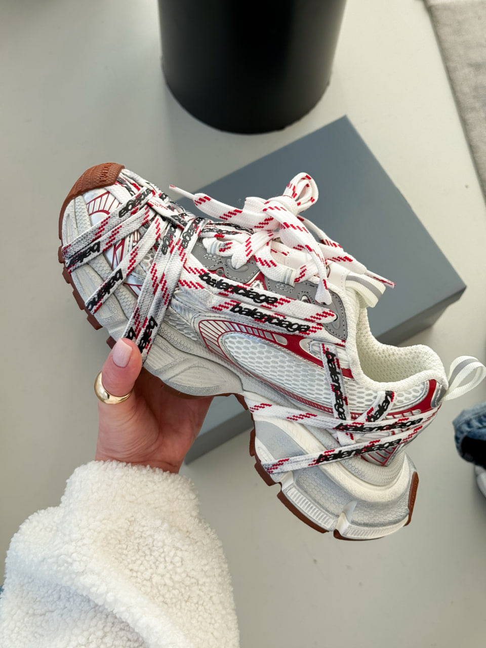 Balenciaga 3xl Extreme Laces Red/White Logo — стильні кросівки червоно-білого кольору з масивною підошвою та характерним дизайном для виразного образу.