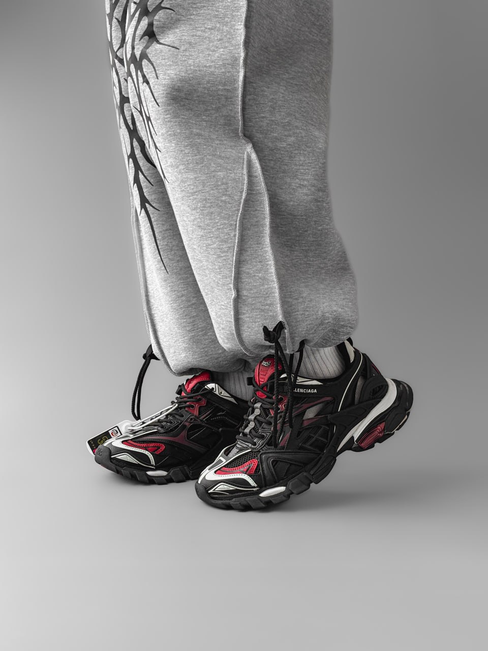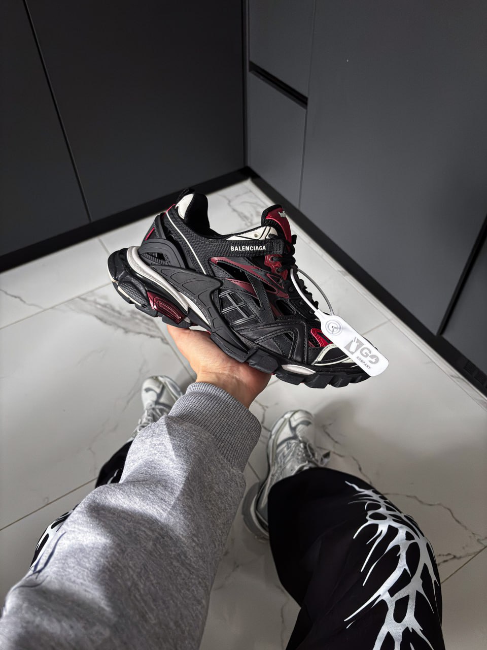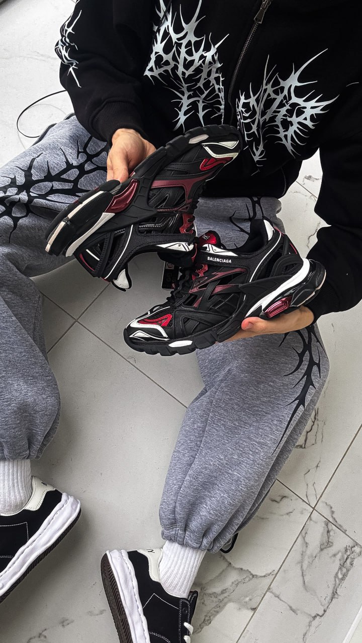 Balenciaga Track 2 Trainer Black Red — це масивні кросівки з багатошаровим техно-дизайном у чорних і червоних тонах, що поєднують спортивну естетику та провокативний стиль.