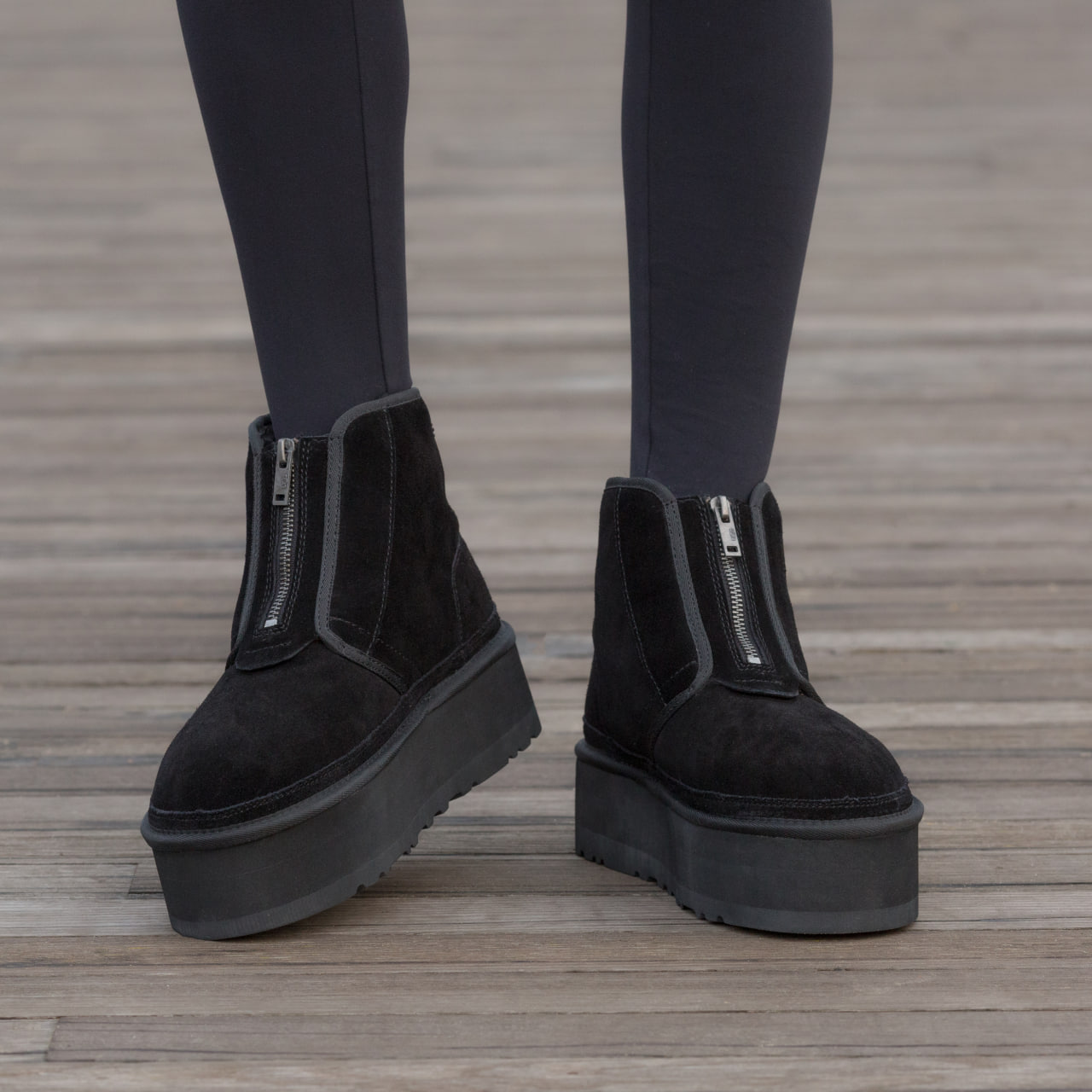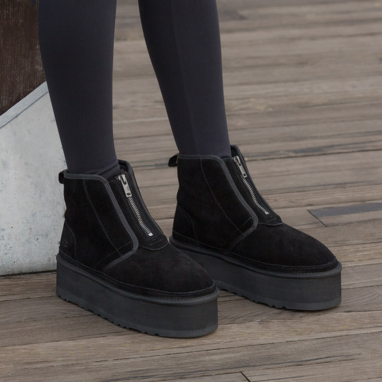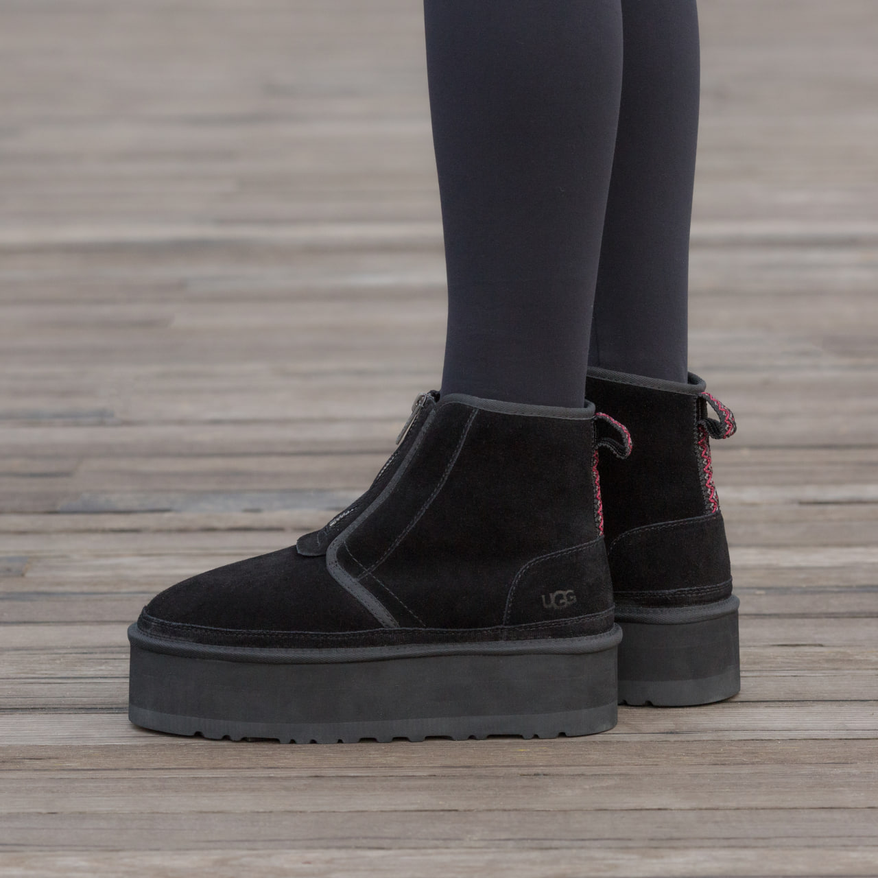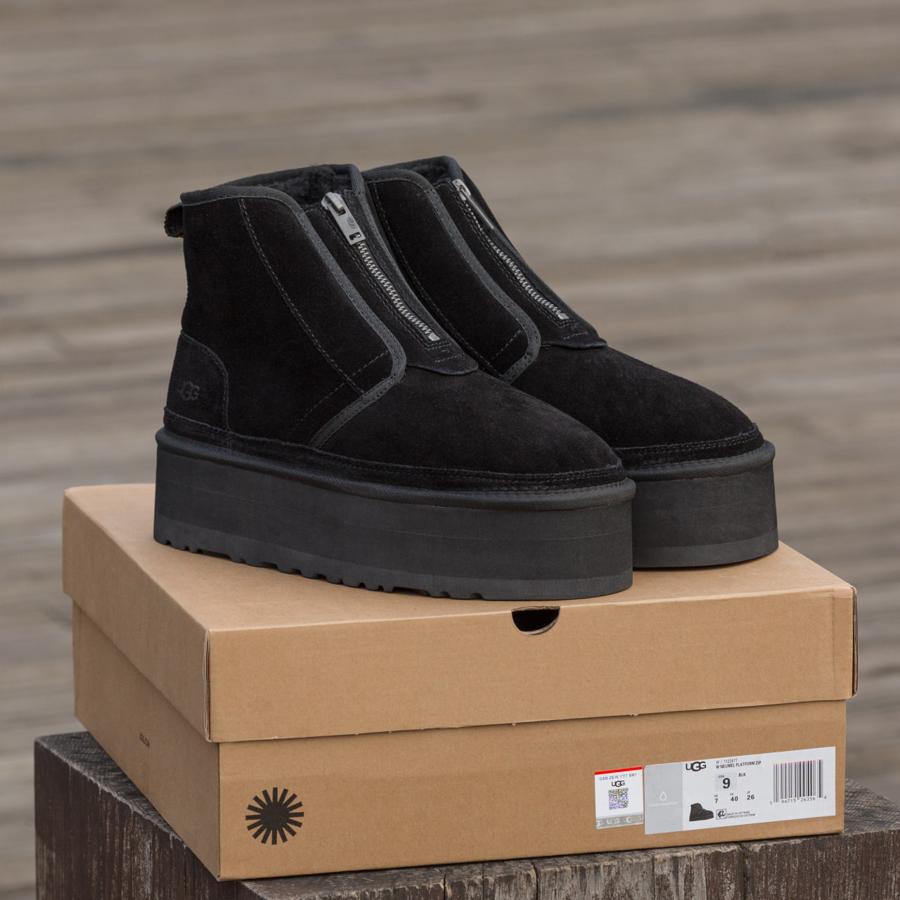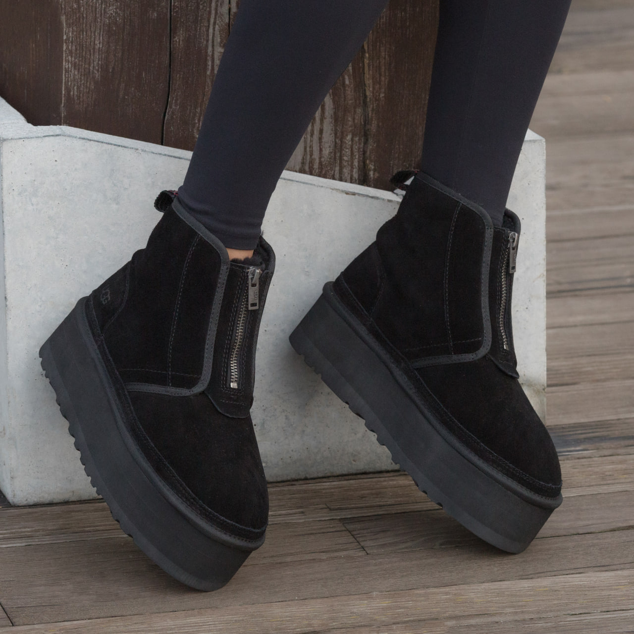 Ugg Neumel Platform Zip Slipper Black  – тепла затишна модель на підошві-платформі з м’якою овчиною всередині.  Чорний універсальний відтінок, комфорт і стиль для щоденного носіння в прохолодну погоду.