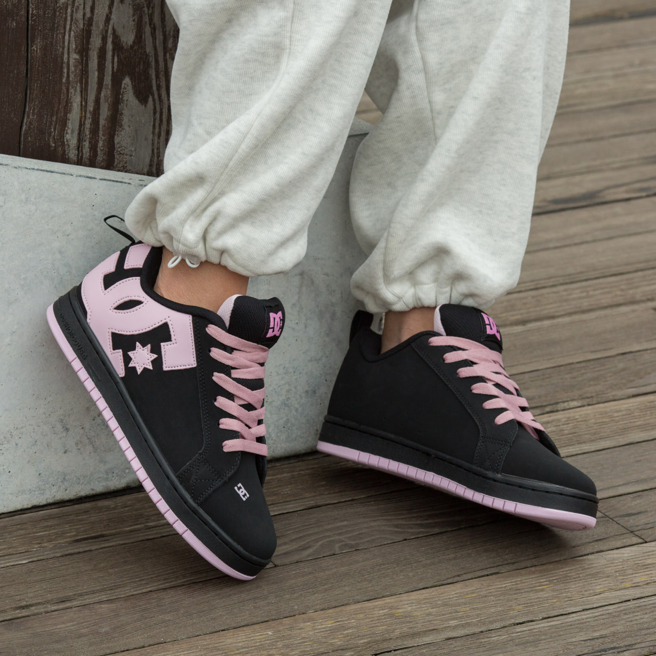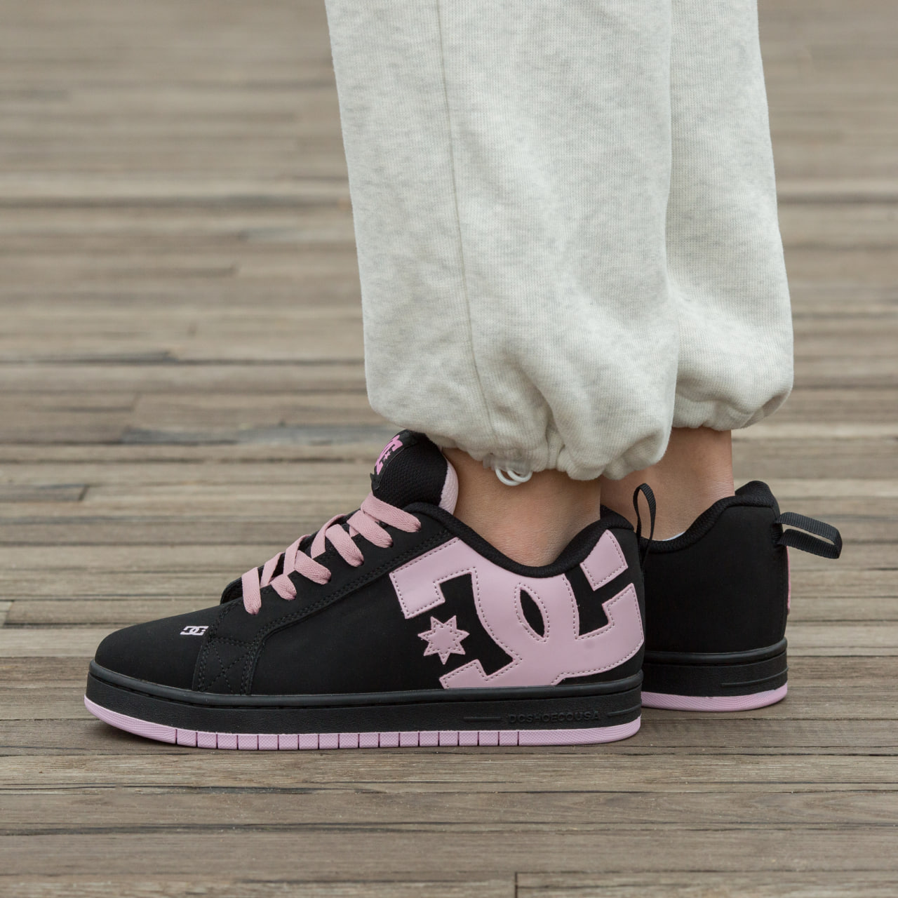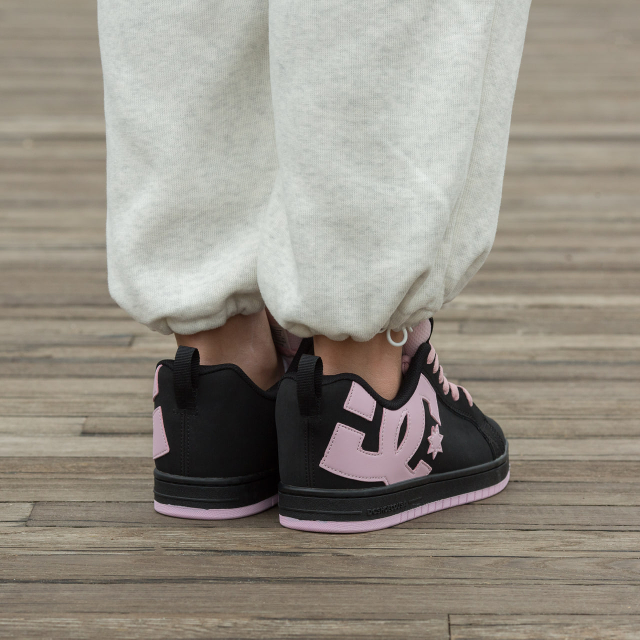 DC Court Graffik Black Pink — масивні скейтерські кросівки з чорним верхом, акцентованим рожевими деталями та великим логотипом бренду.