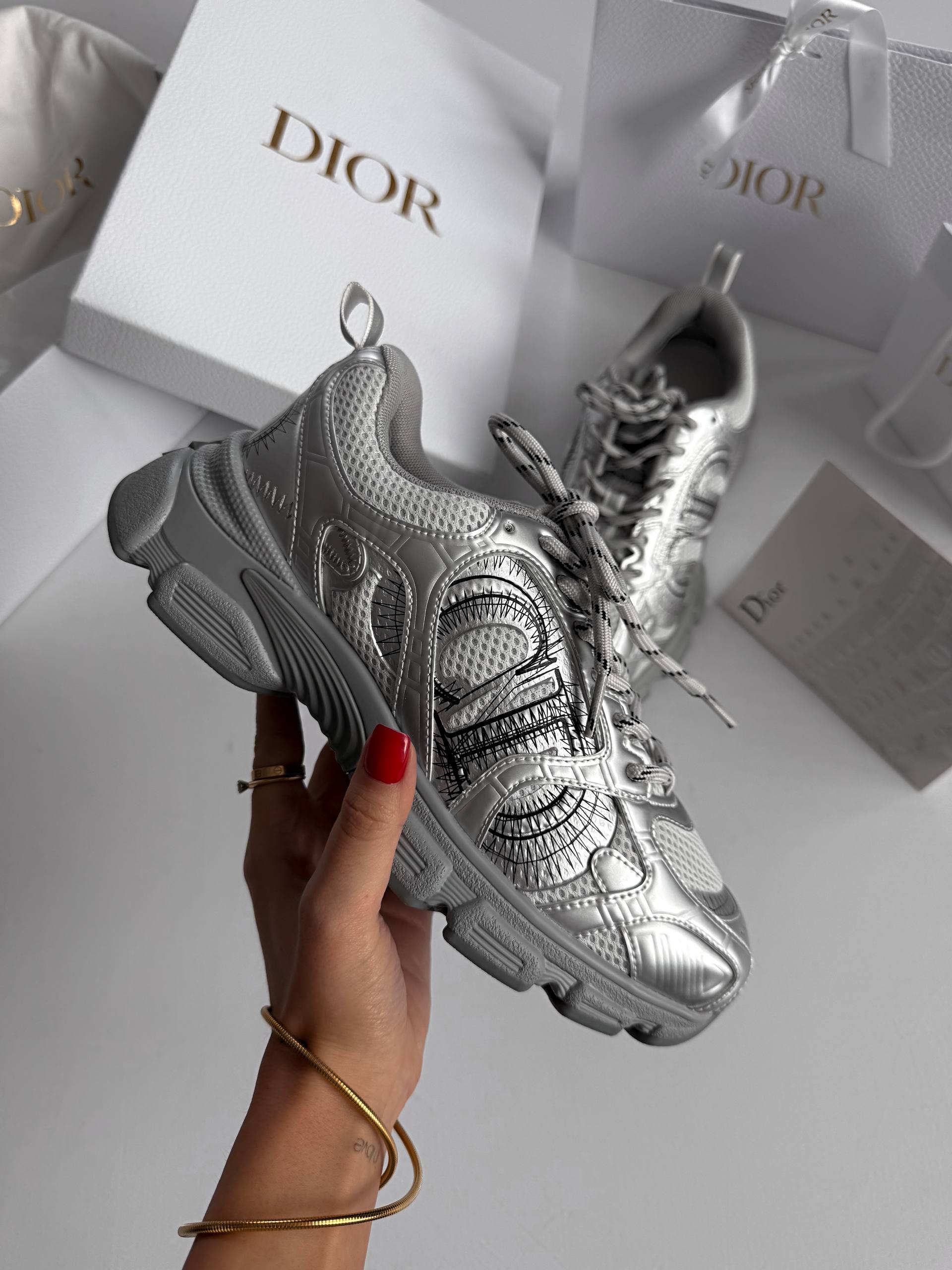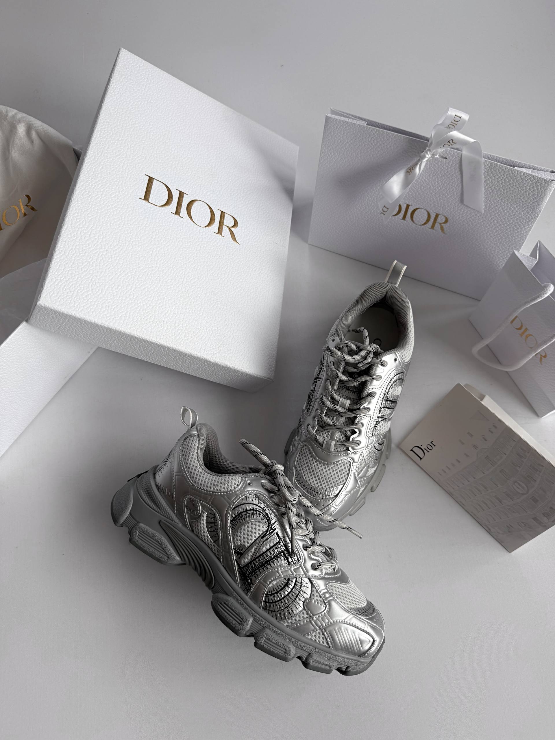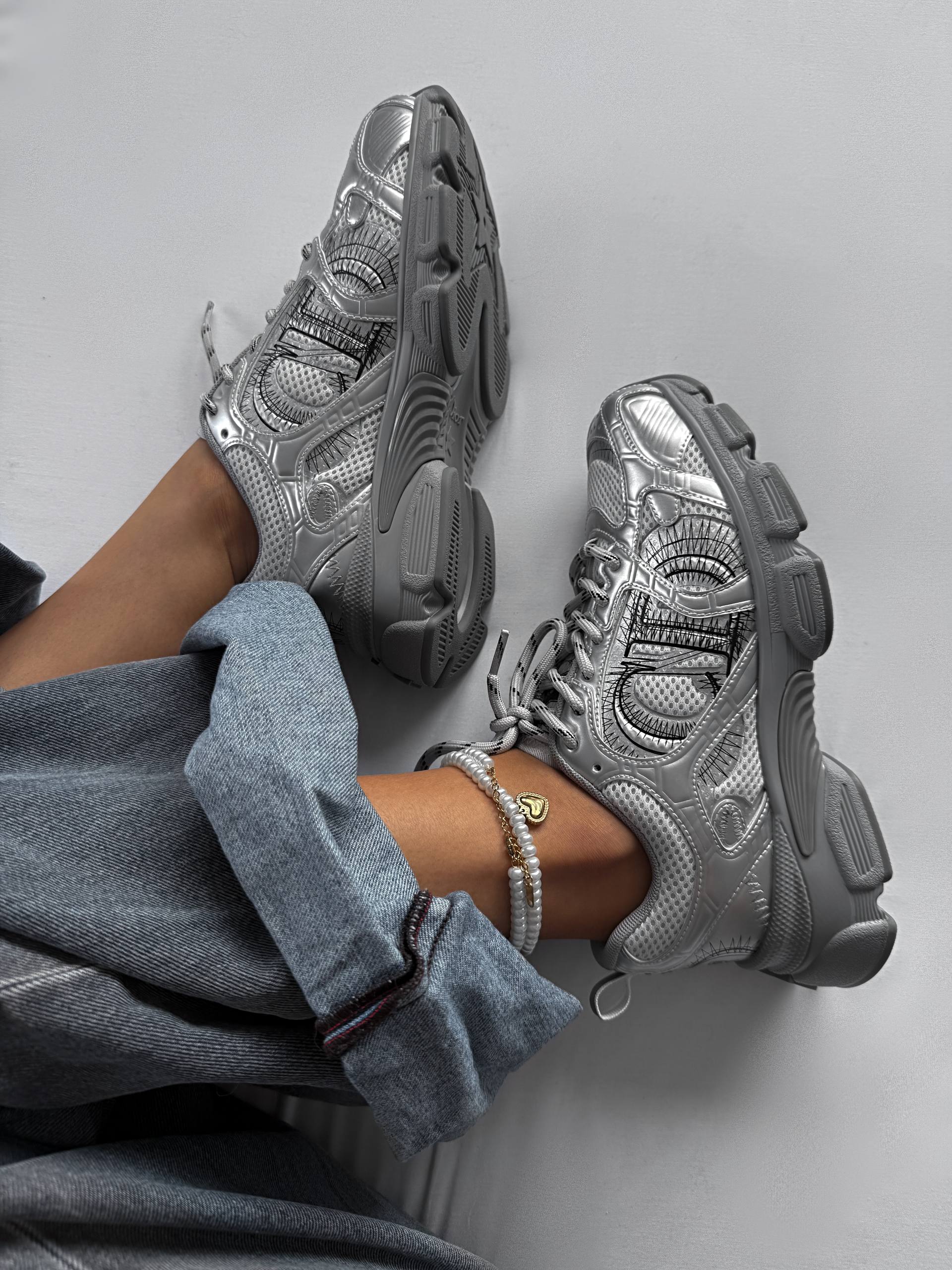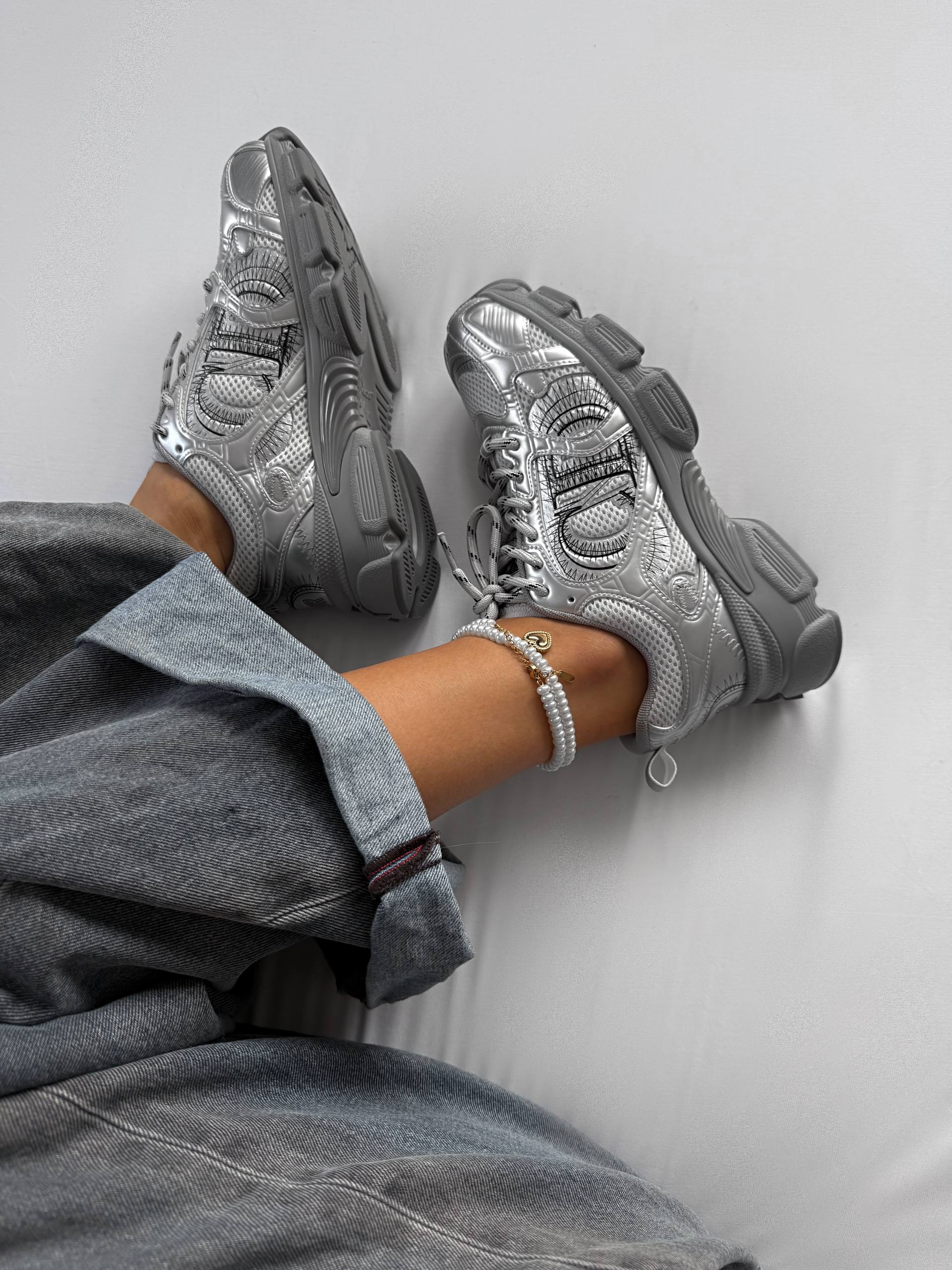 Dior Chrono Sneaker Silver — це стильні кросівки у спортивно-люксовому дизайні з легкою сітчастою основою та срібними вставками, що додають образу блиску й сучасності.