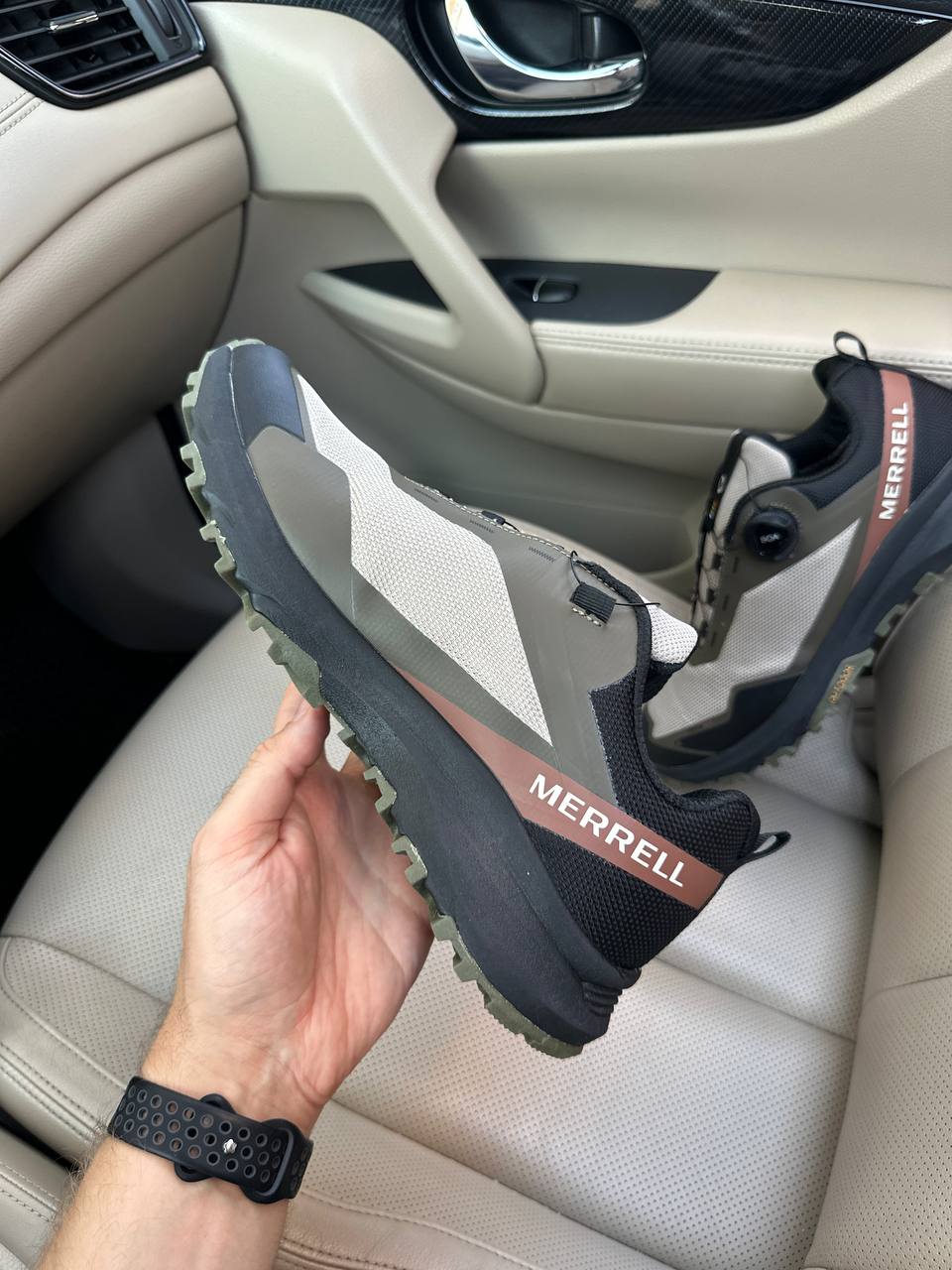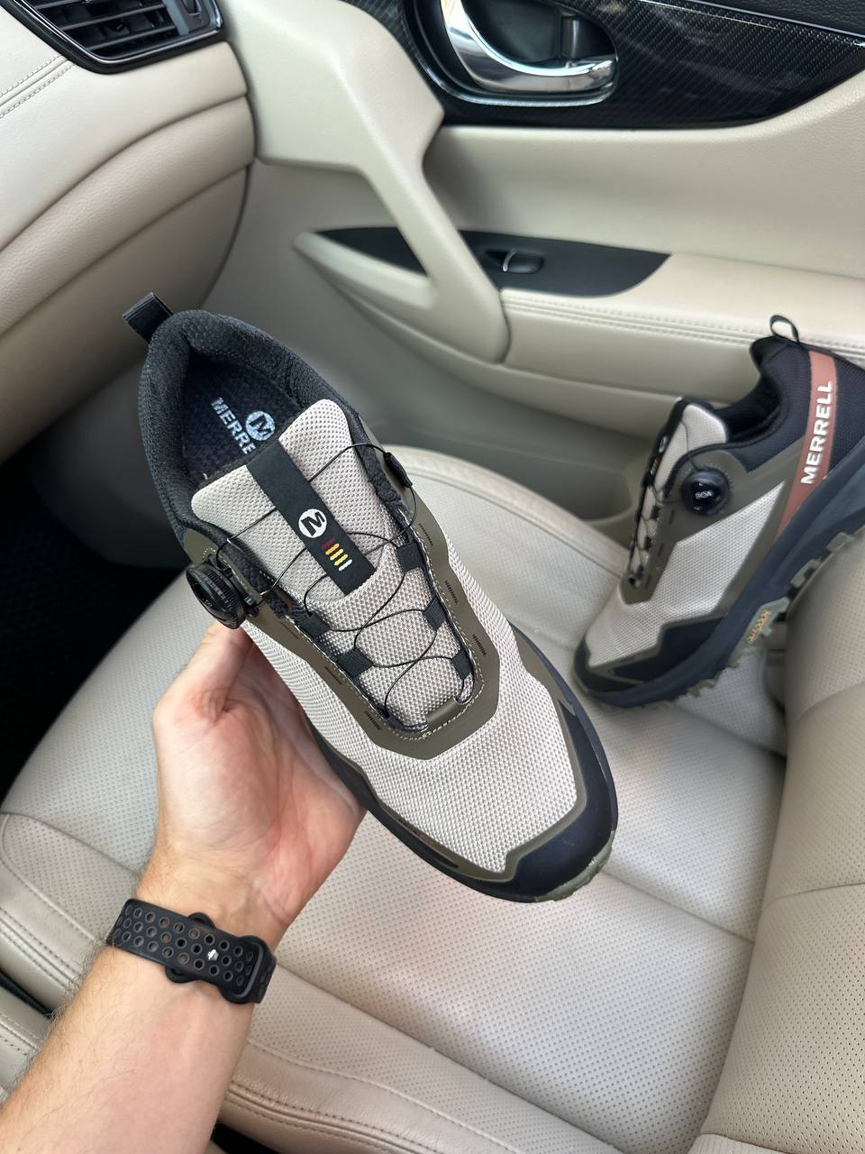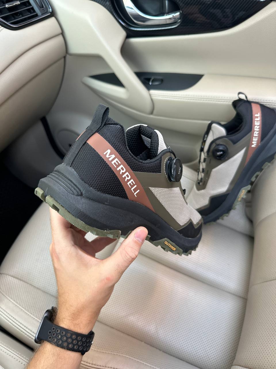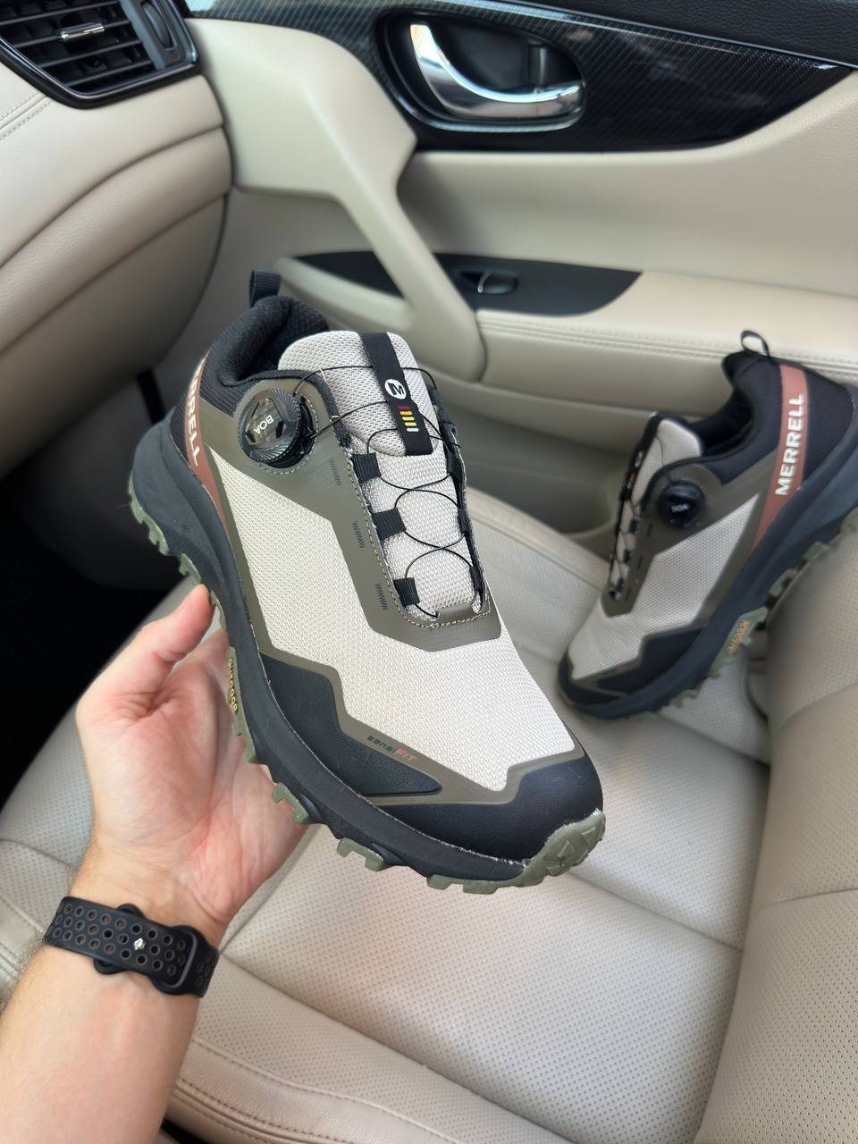 Merrell Shimano BOA Beige Black Khaki — Термозахищені кросівки із мембраною Gore-Tex, технологією затяжки BOA для ідеальної посадки. Верх із текстилю та шкіри в бежево-хаки кольорах, підошва - стійка до слизьких поверхонь. Ідеальні для осені та м’якої зими