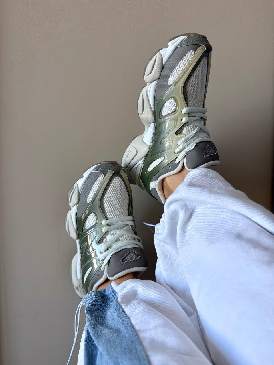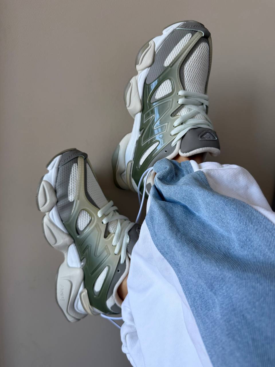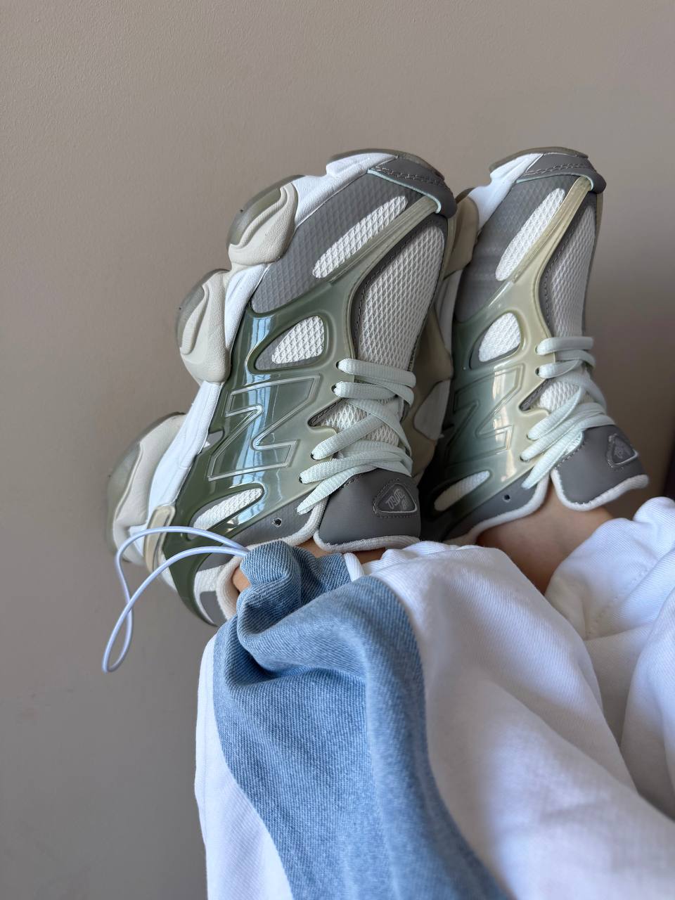 New Balance 9060 Olive Grey White — стильні ретро-кросівки в оливково-сірому з білими акцентами з масивною підошвою і комфортною амортизацією для щоденного носіння.