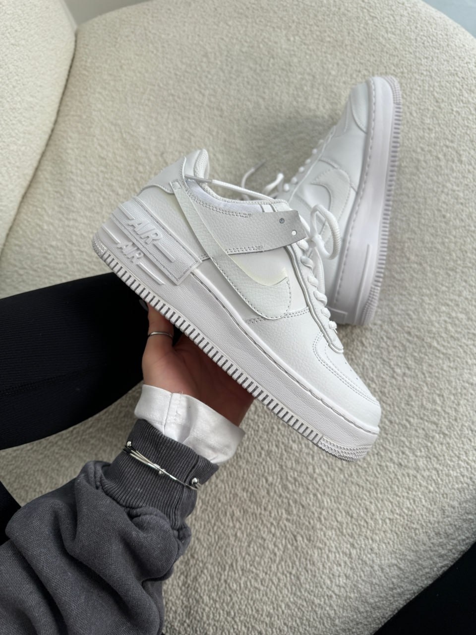 Nike Air Force Shadow White — це об’ємні кросівки з подвоєними деталями та чистим білим кольором, що додають образу стильної багатошаровості.