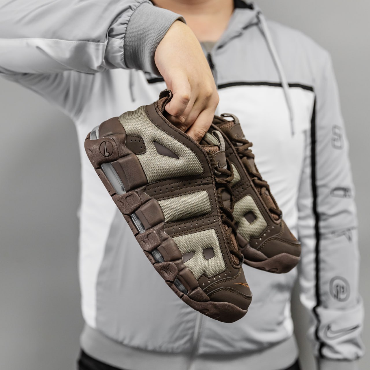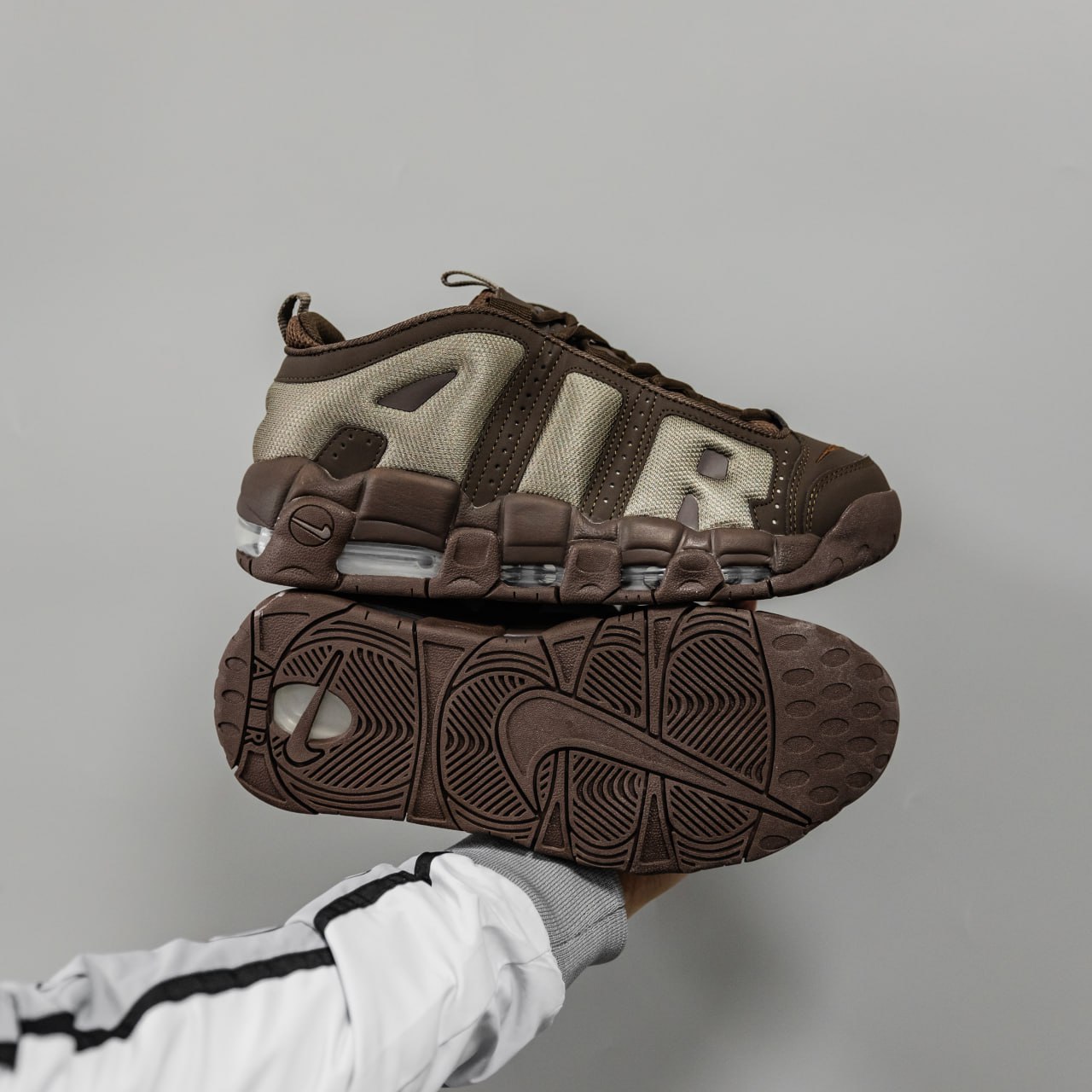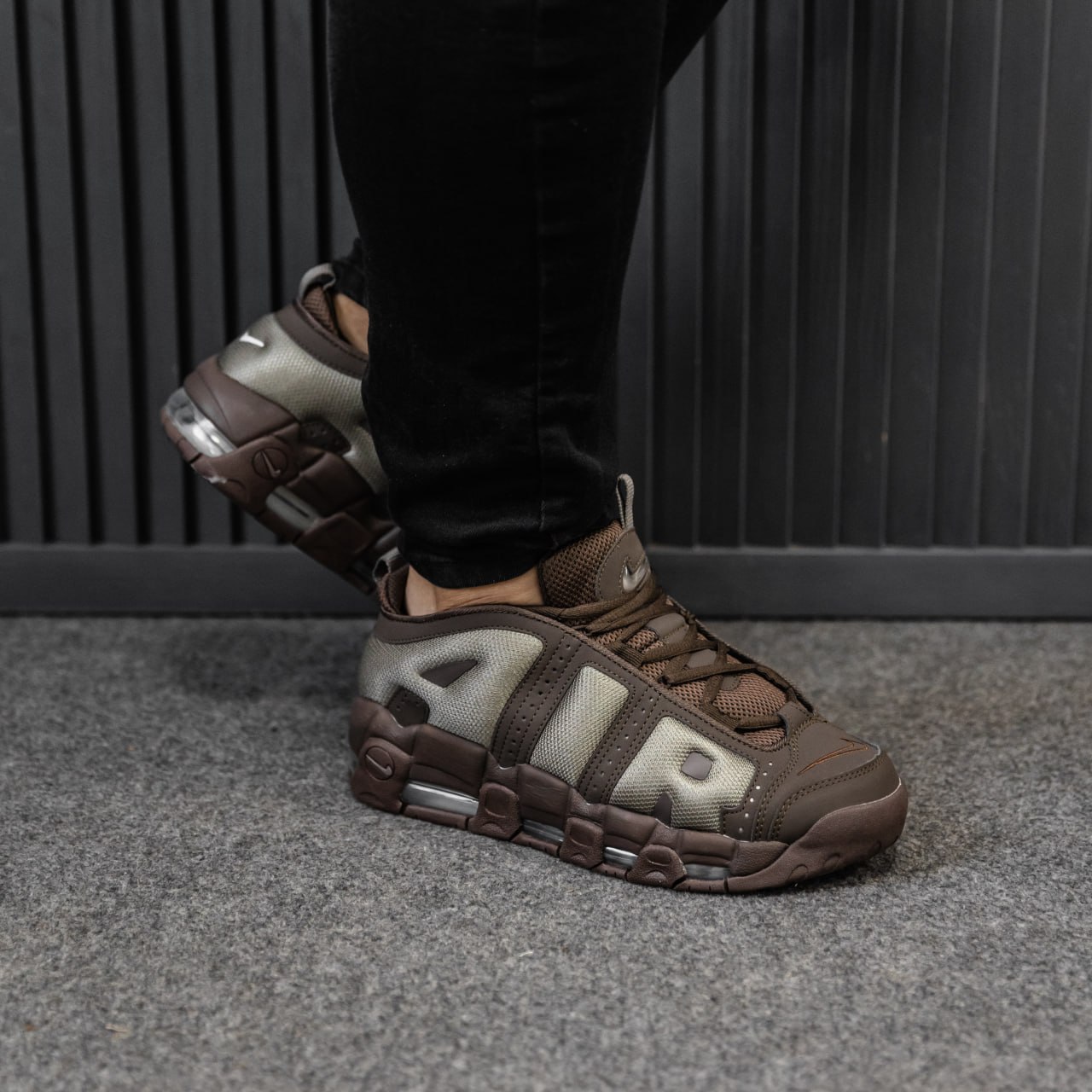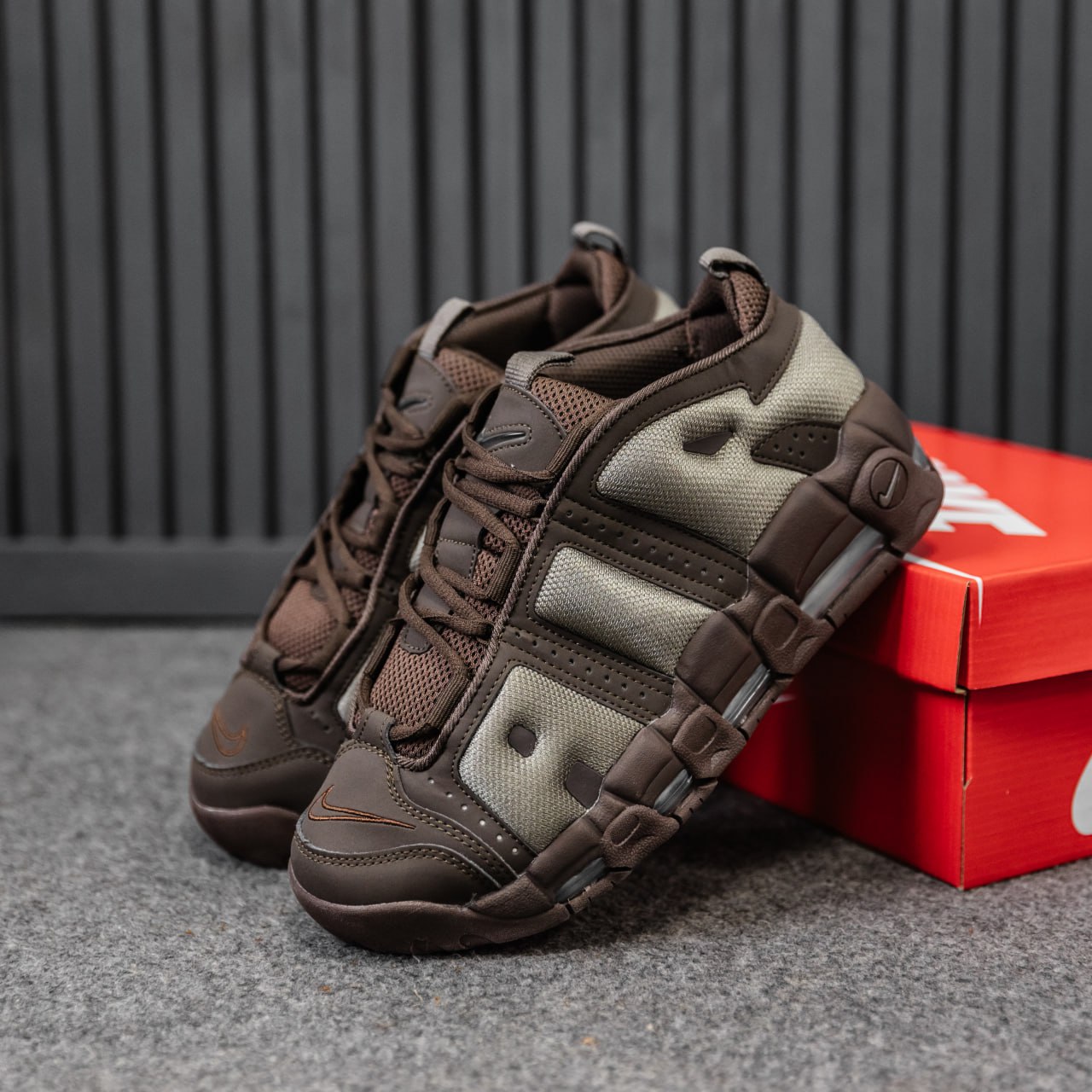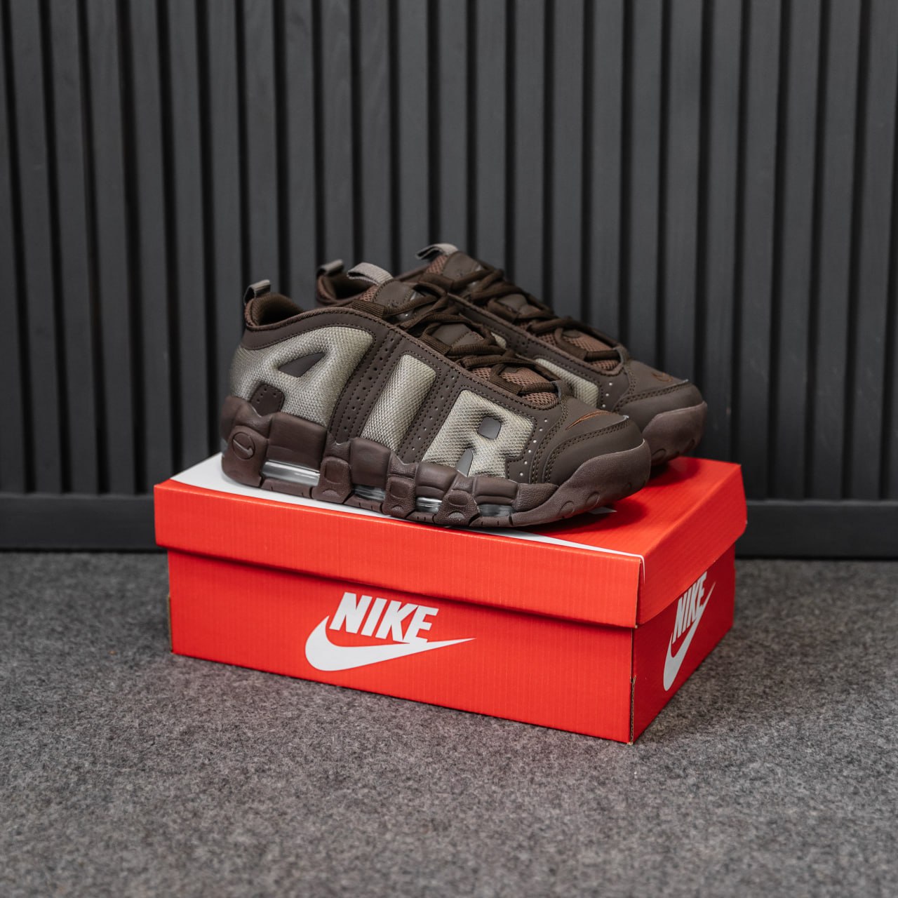 Nike Air More Uptempo Brown Low — стильні кросівки з впізнаваним масивним дизайном та великим написом “AIR”, виконані у теплих коричневих тонах для комфортного повсякденного носіння.