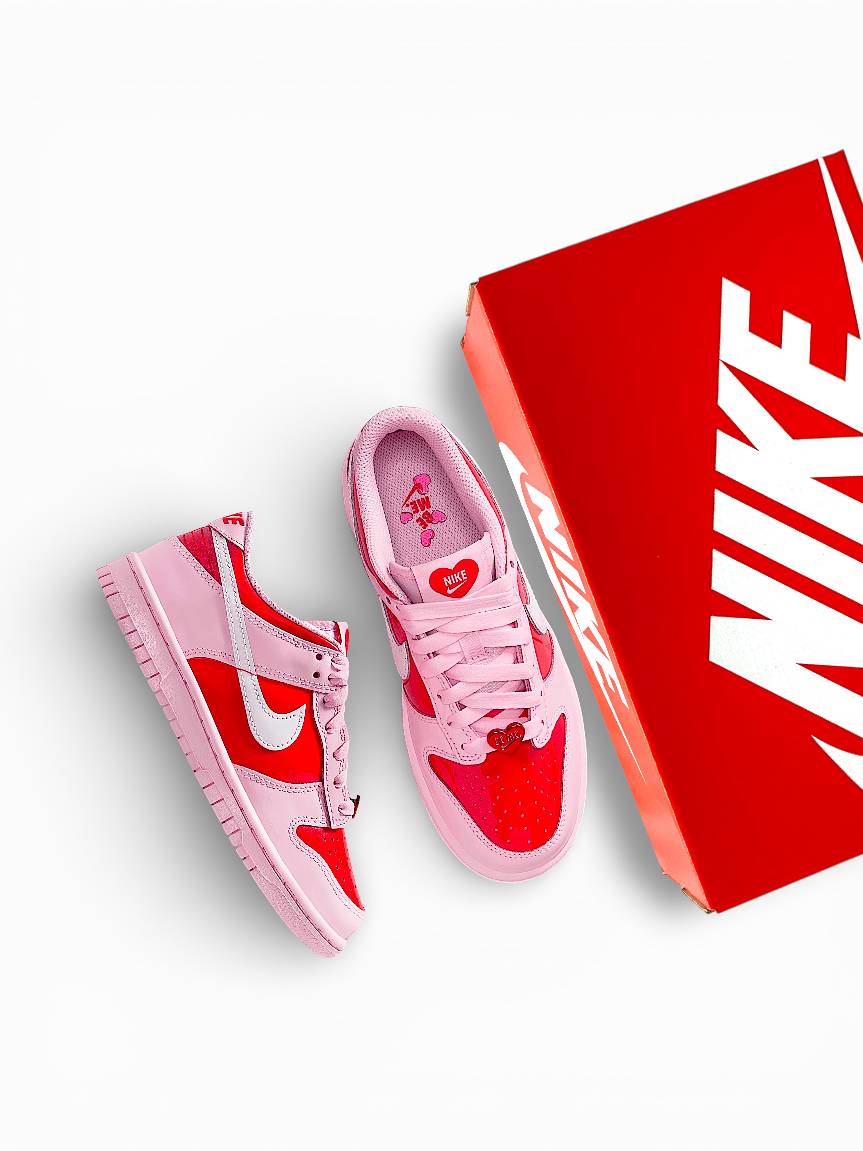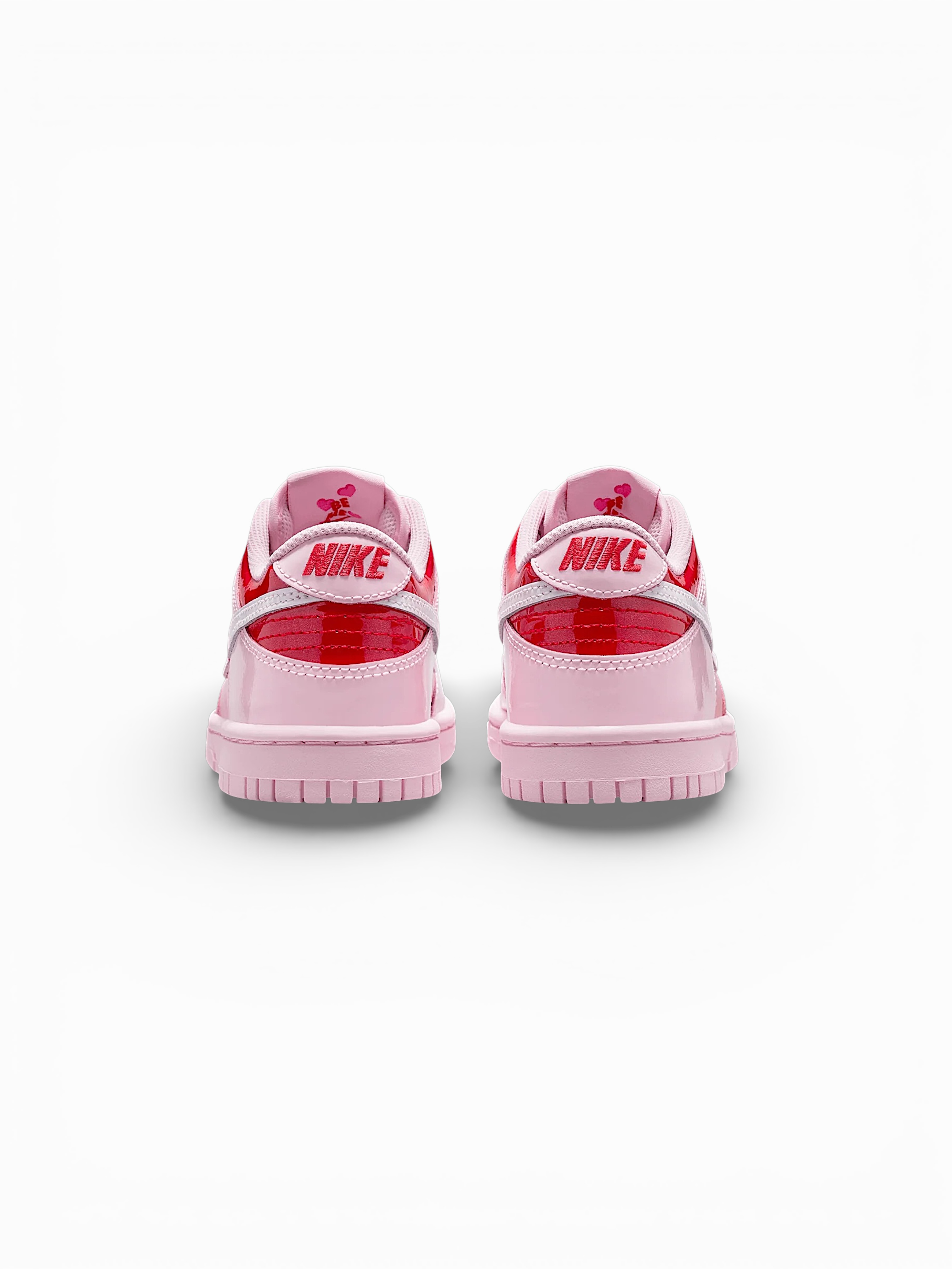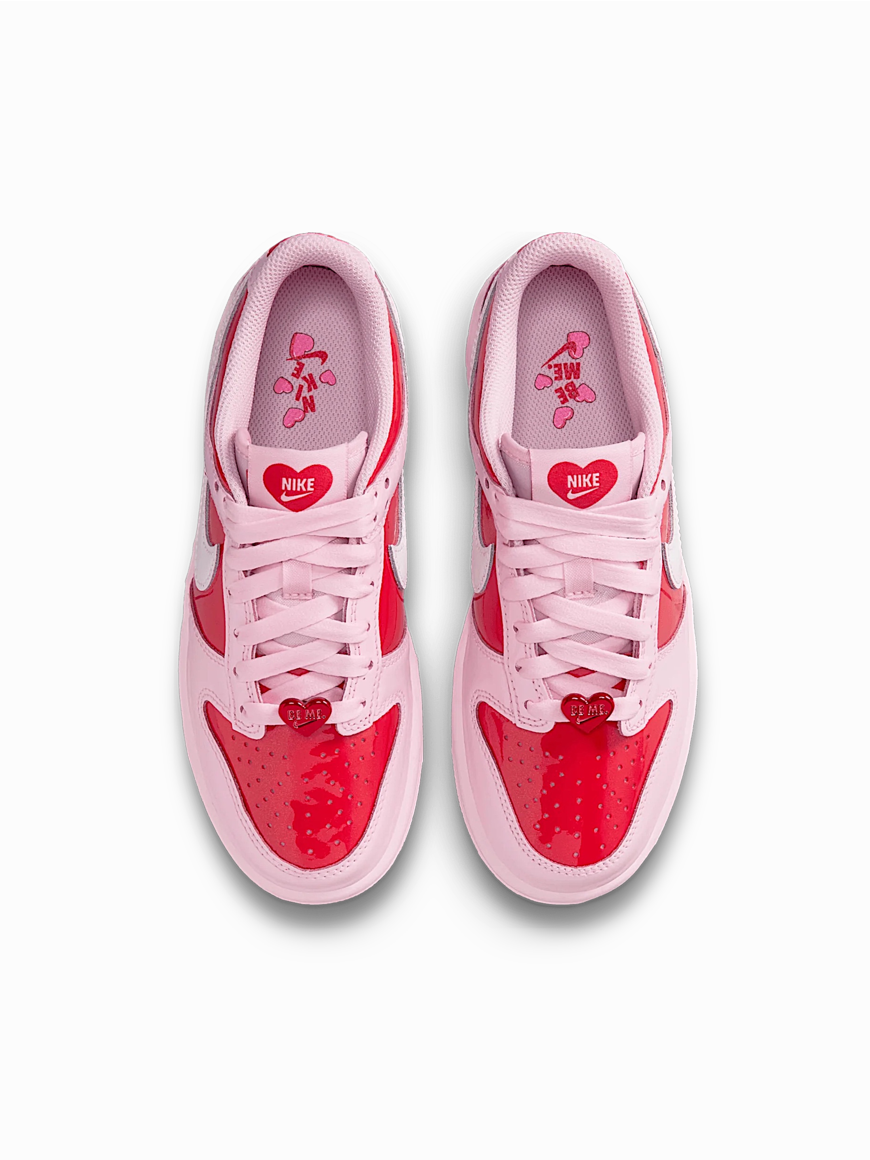 Nike Dunk Low GS Valentine’s Day – стильні дитячі кросівки з яскравим рожево-червоним дизайном, ідеальні для святкового образу.