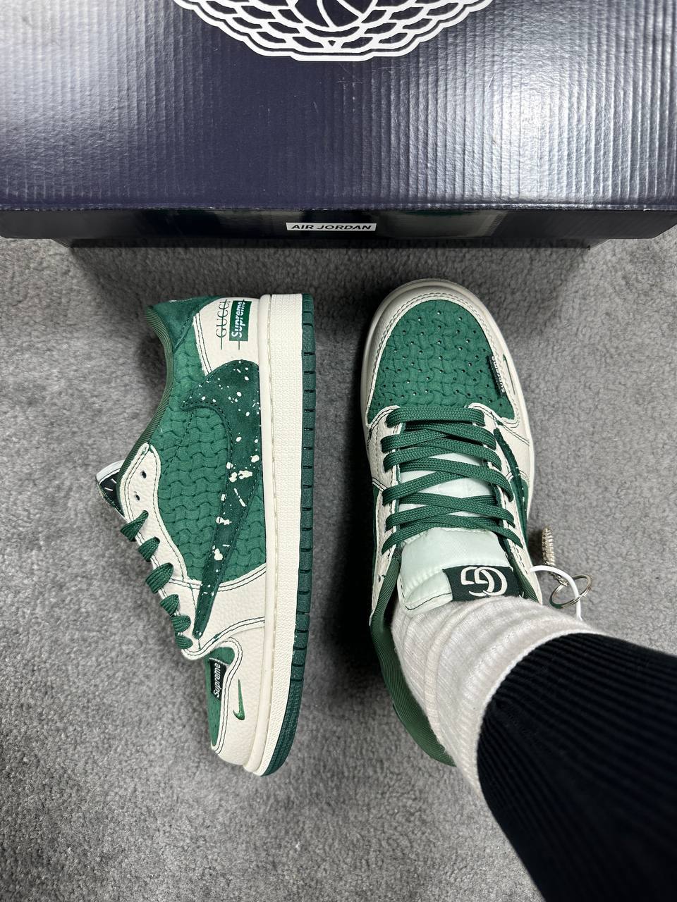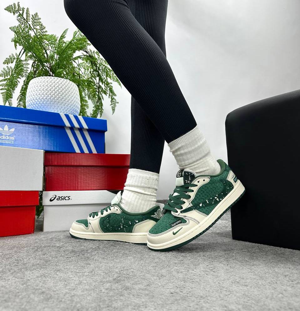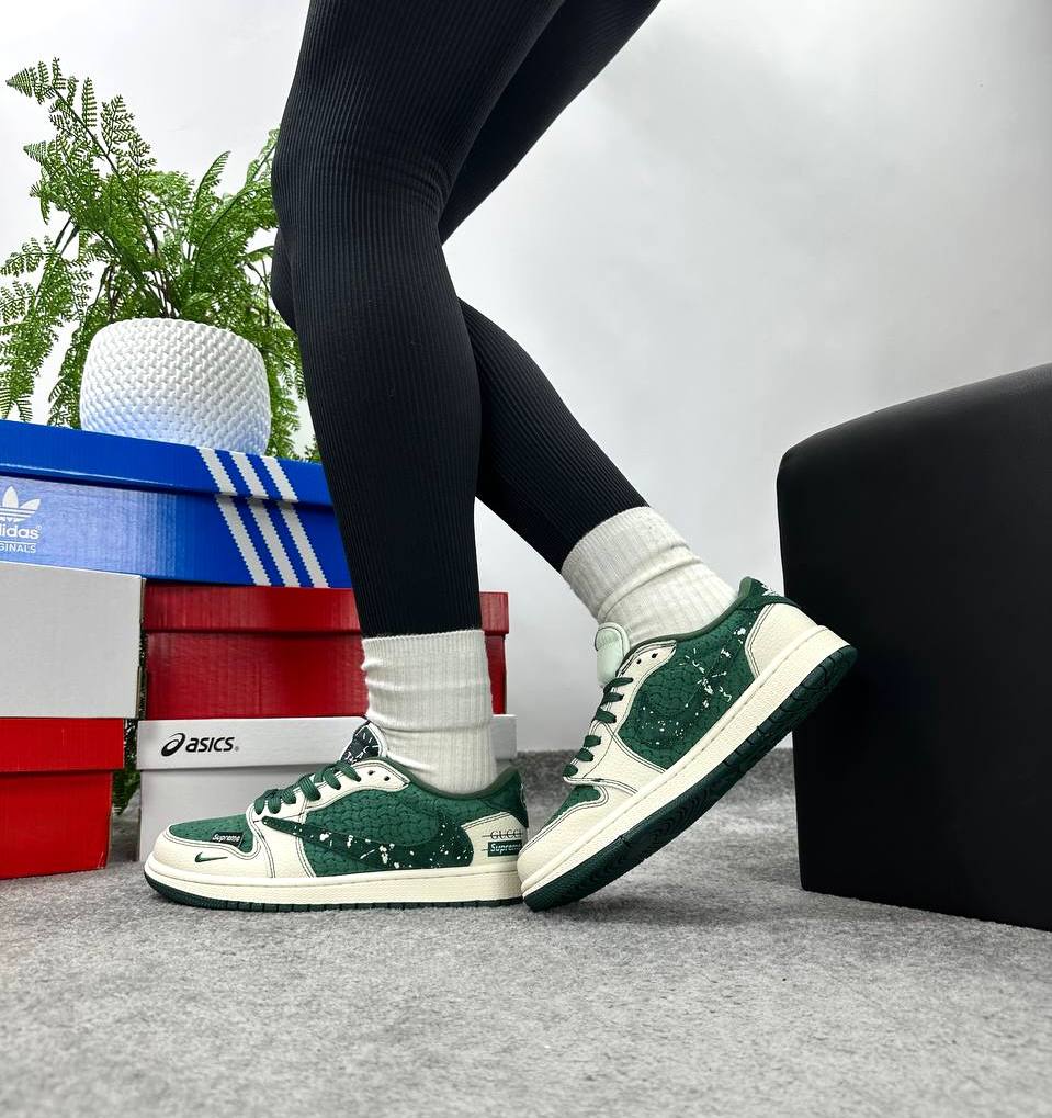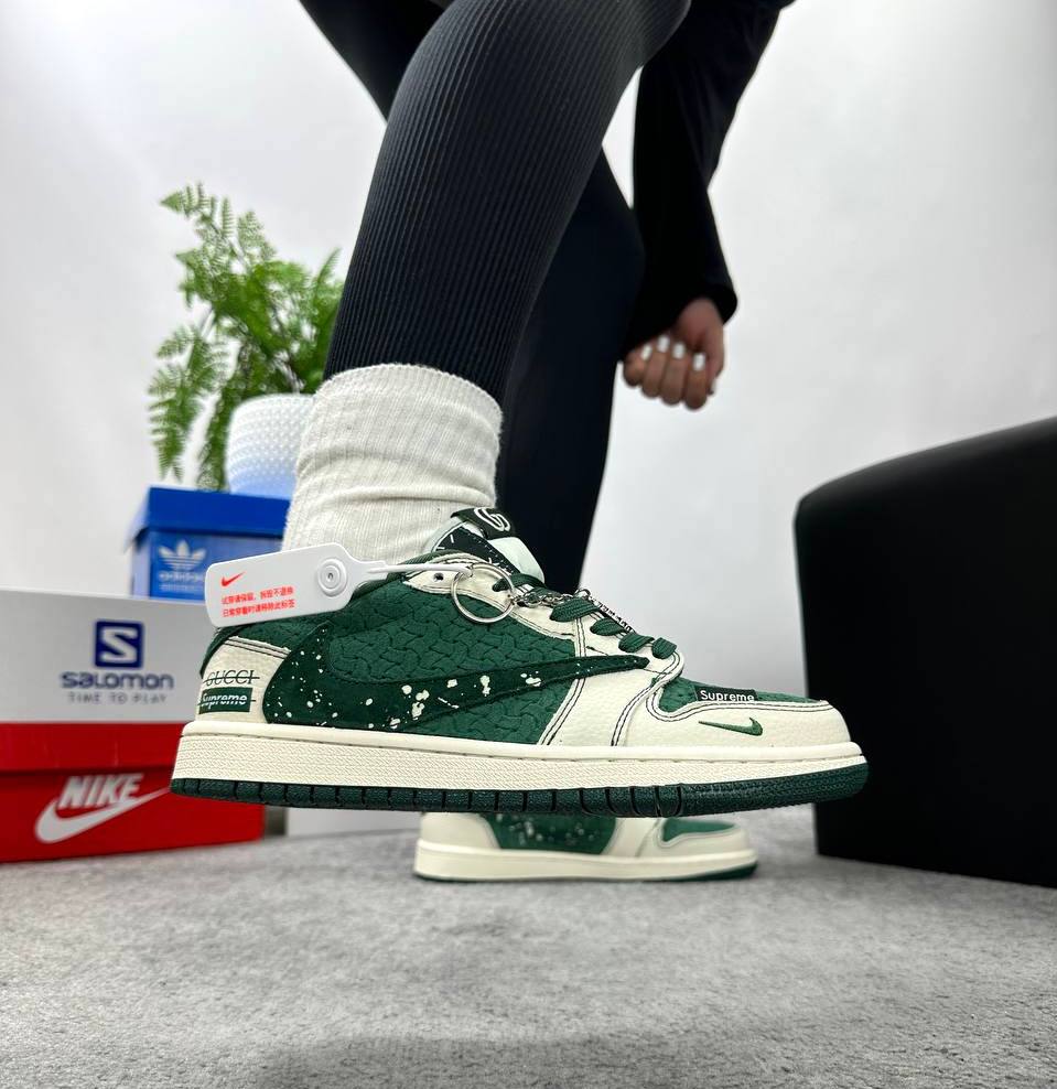 Nike Jordan 1 Low x Travis Scott x Gucci x Supreme — це яскраві кросівки, що поєднують фірмові елементи всіх брендів у стильному та помітному дизайні.