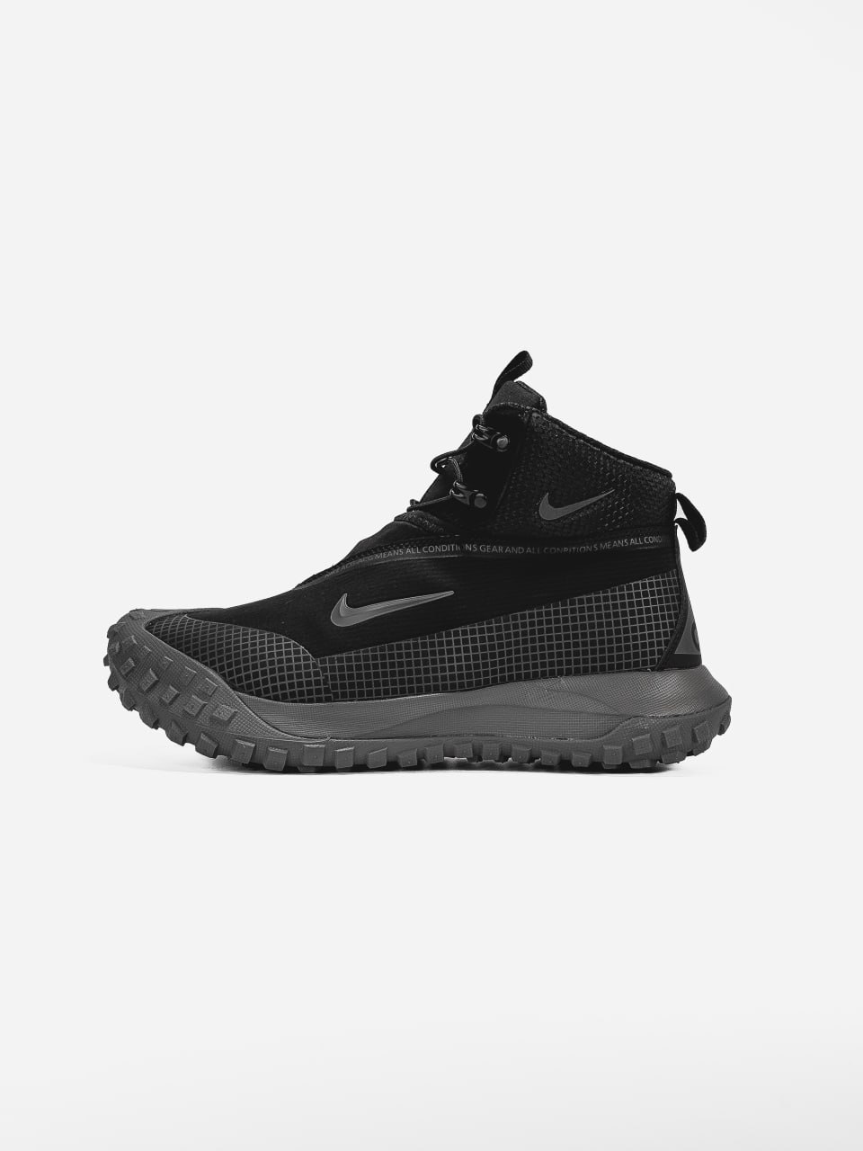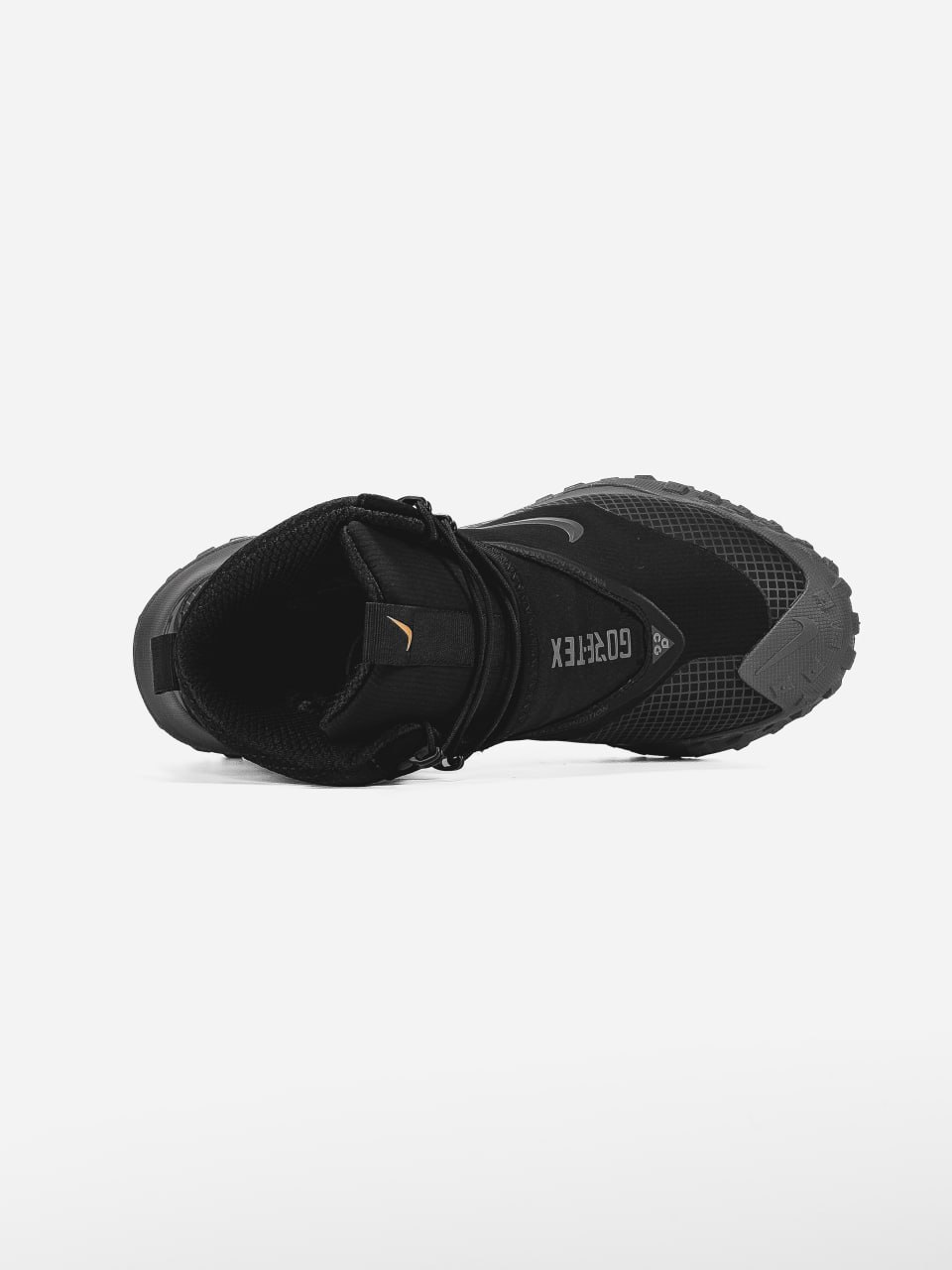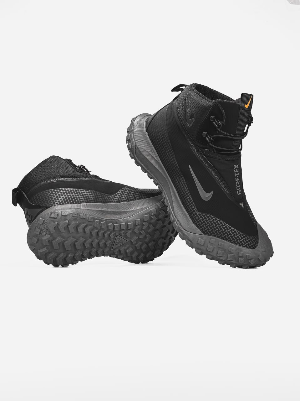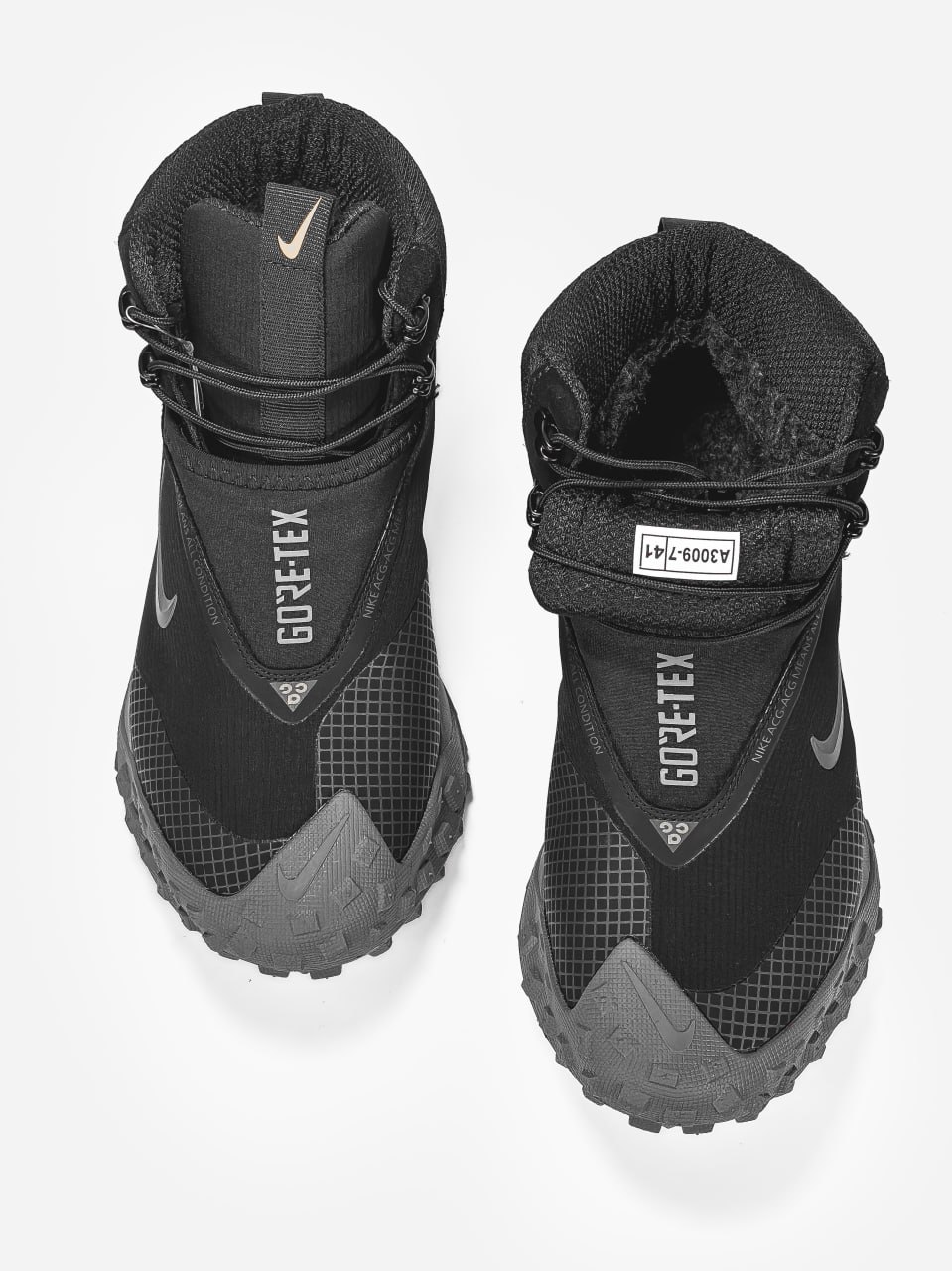 Nike ACG Mountain Fly Gore-Tex Fur Black/Grey — утеплені кросівки-трекинг з мембраною Gore-Tex та хутровою внутрішньою підкладкою, зчепною підошвою й міцним чорним верхом з сірими акцентами.