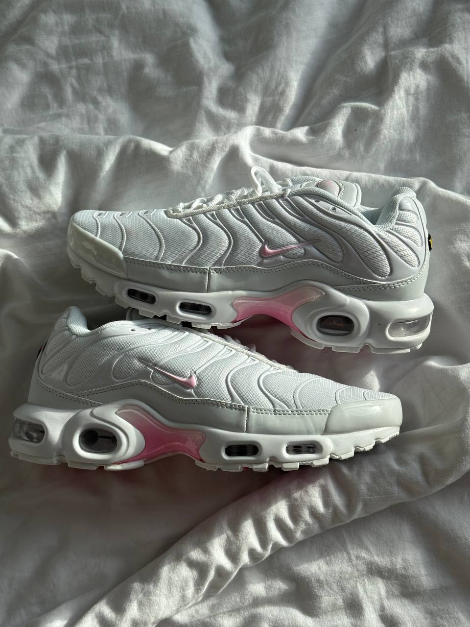 Nike Air Max Plus White/Pink — стильні кросівки з білою основою та ніжно-рожевими акцентами, що поєднують впізнаваний дизайн TN і комфортну амортизацію Air для щоденного носіння.