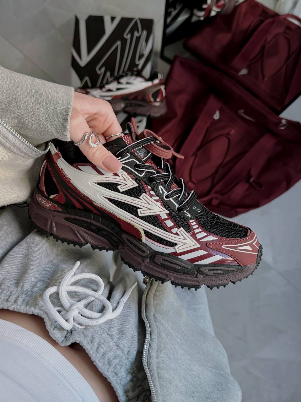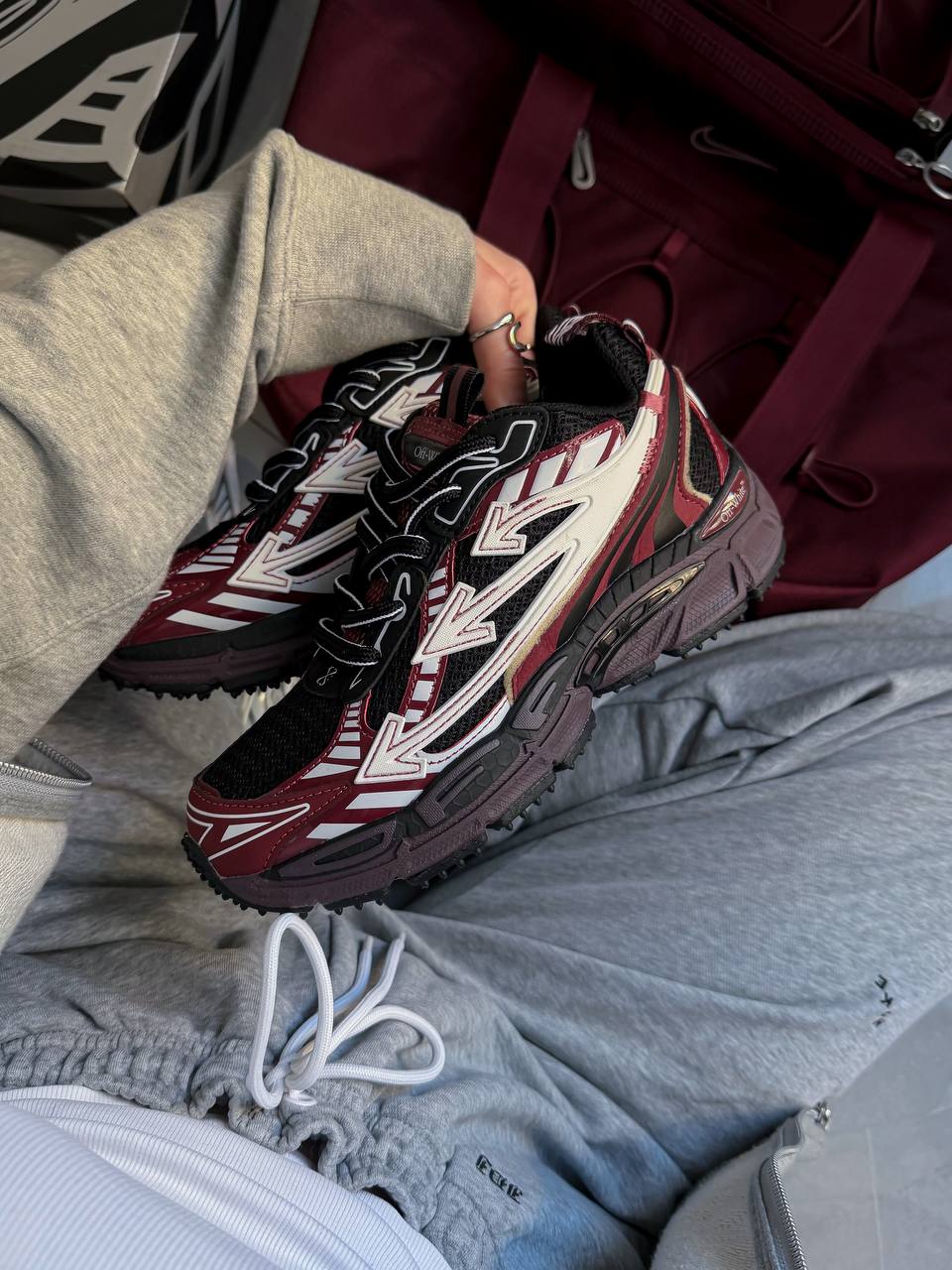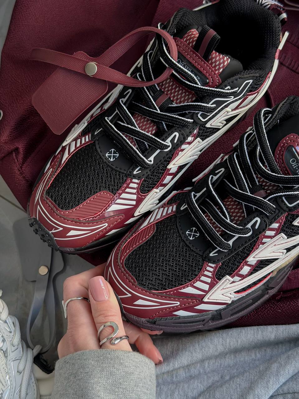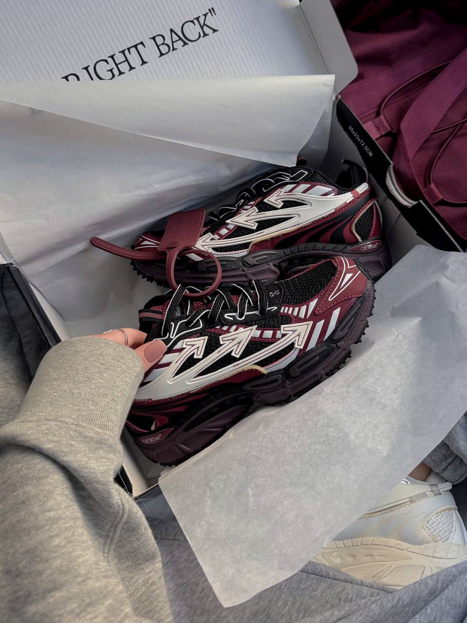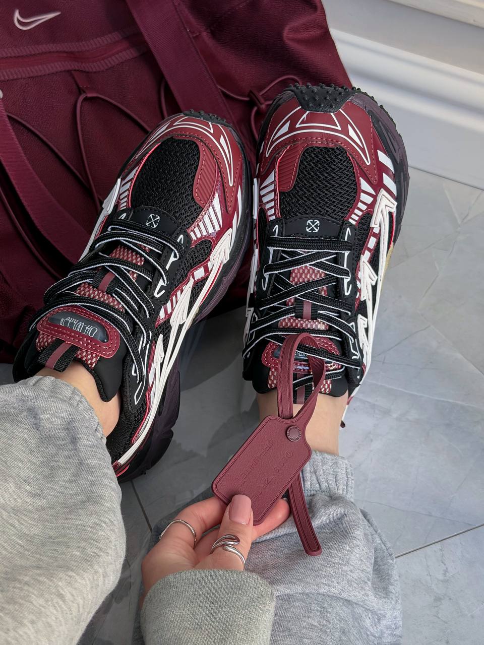 Off-White Right Back Burgundy — кросівки з бордовим акцентом у стилі мультиматеріалу: текстиль, шкіра й гумові накладки.