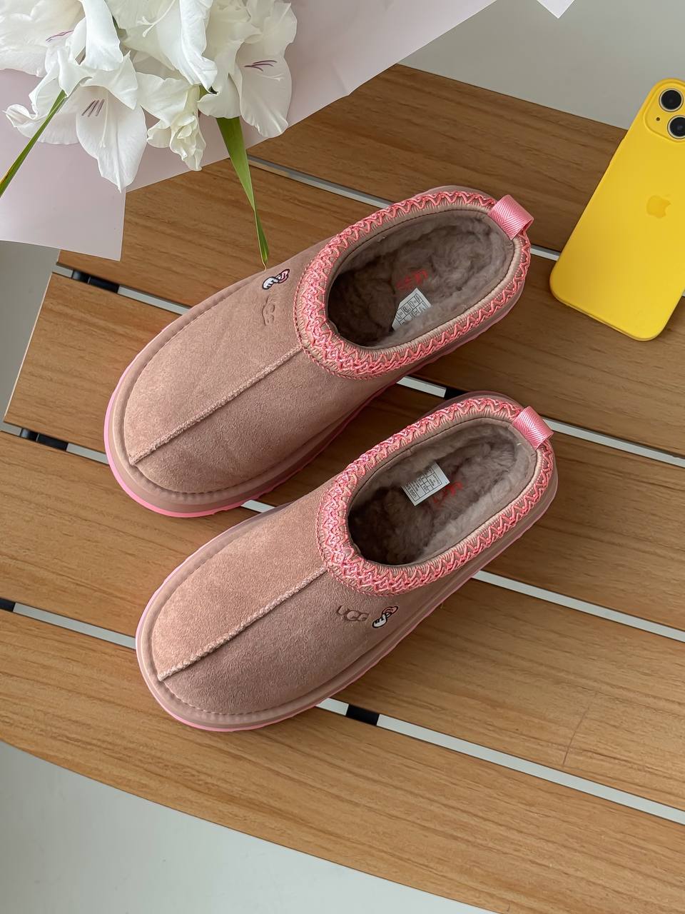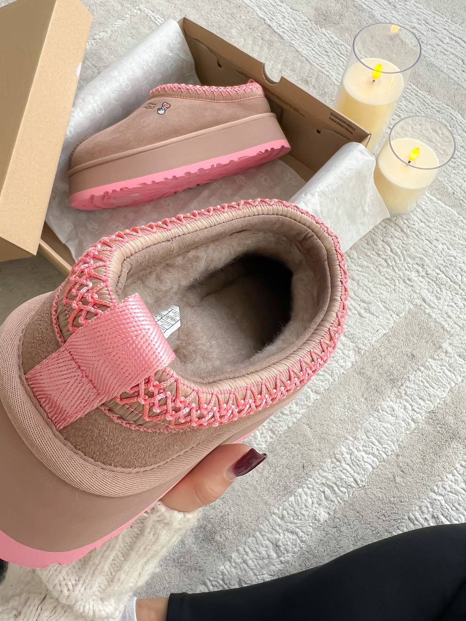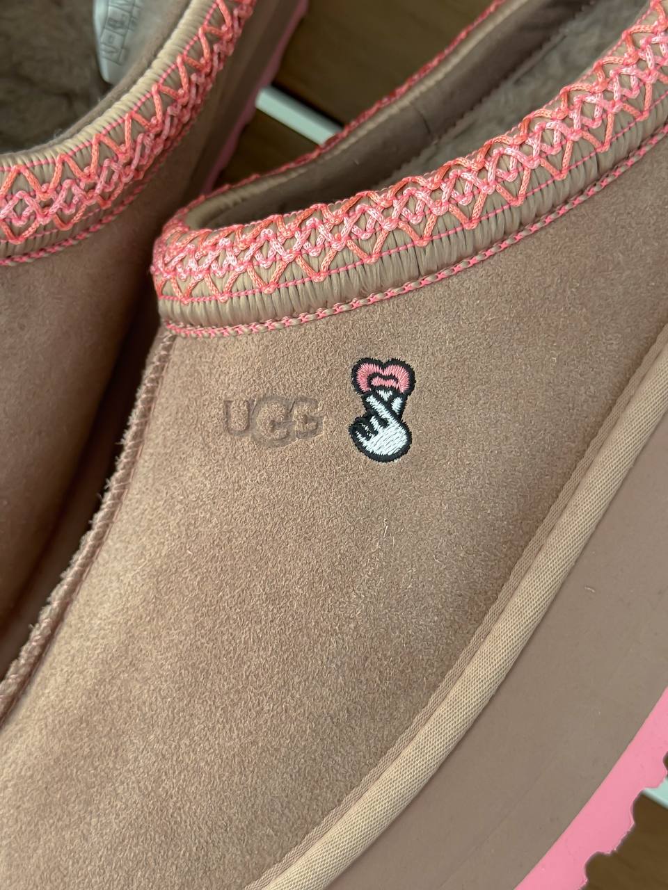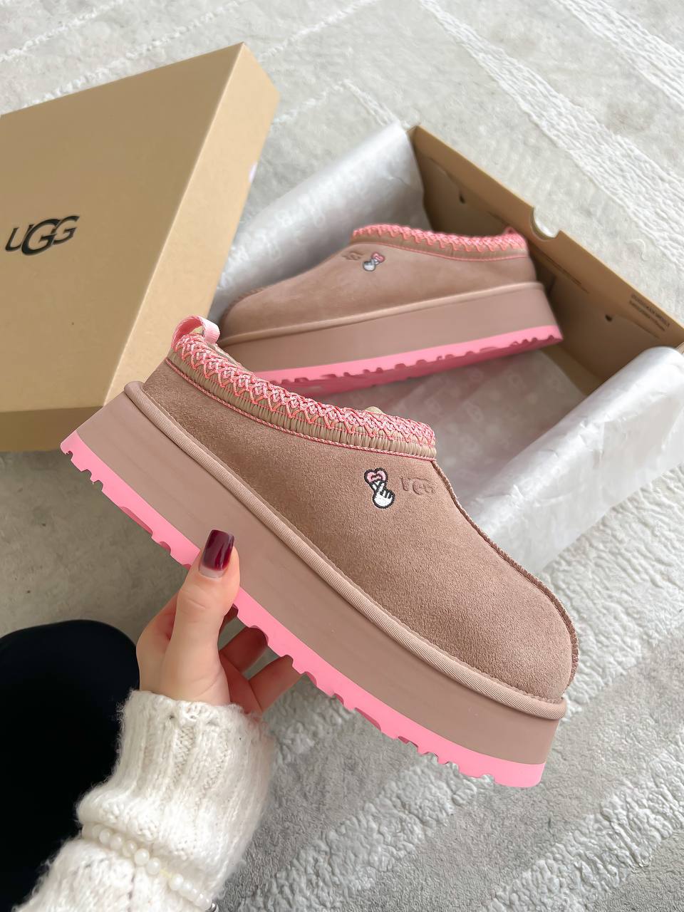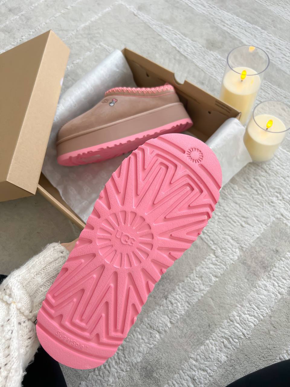 Tasman Platform Love Grey — замшеві сліпони на платформі у сіро-рожевому відтінку з м’якою хутряною підкладкою та фірмовим вишитим декором, що додає затишку й стилю.