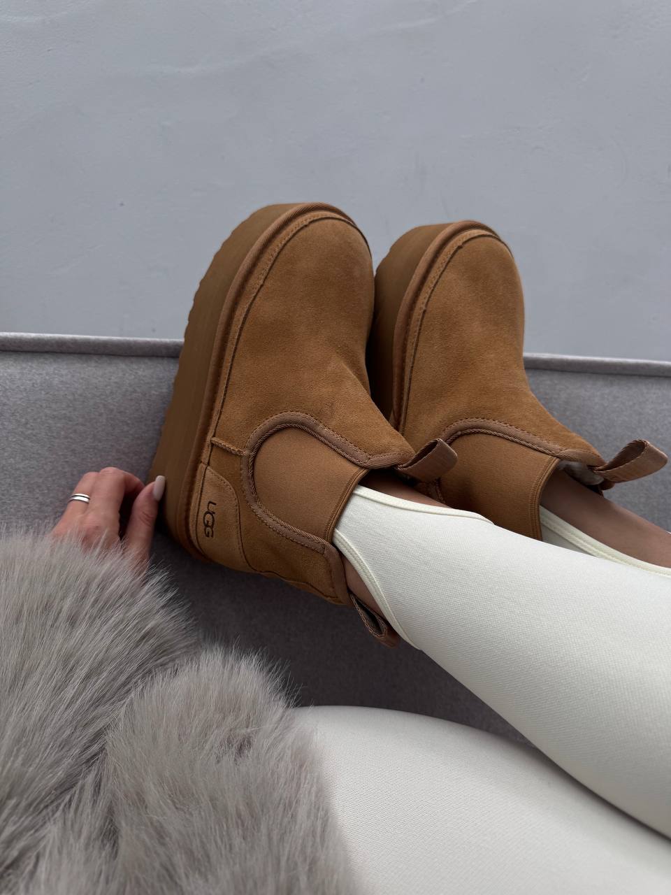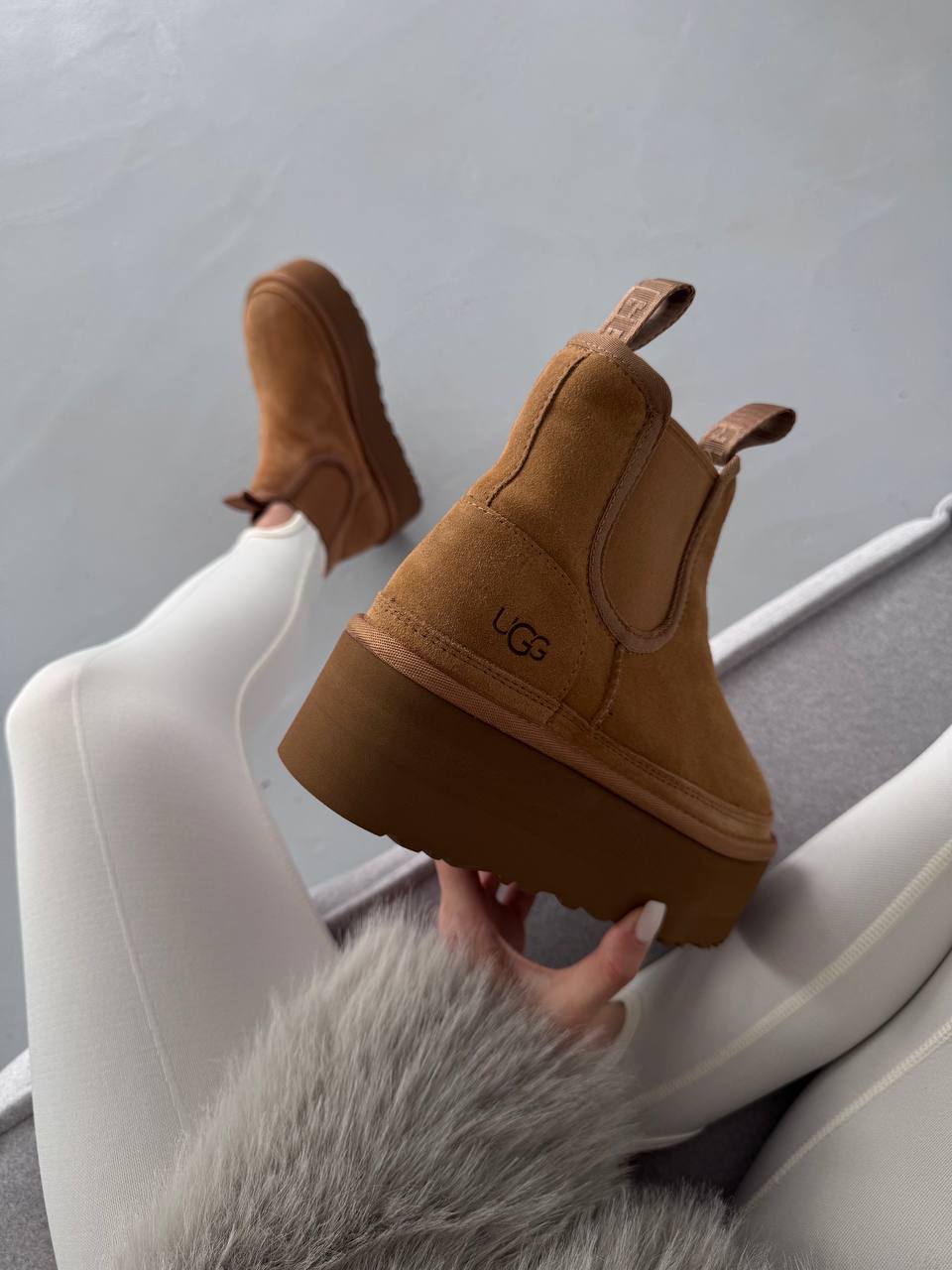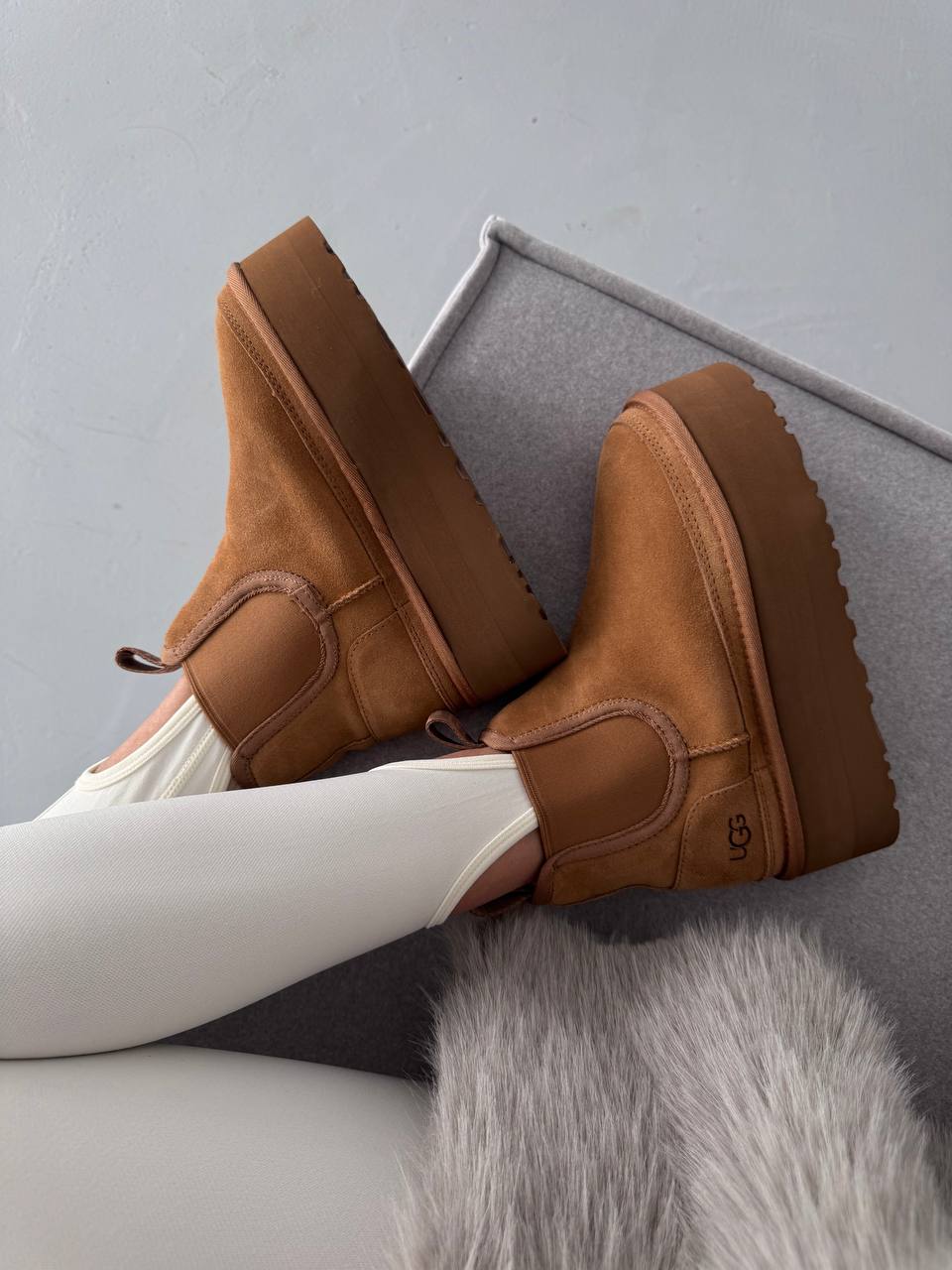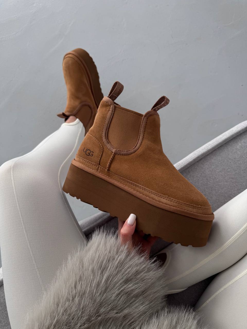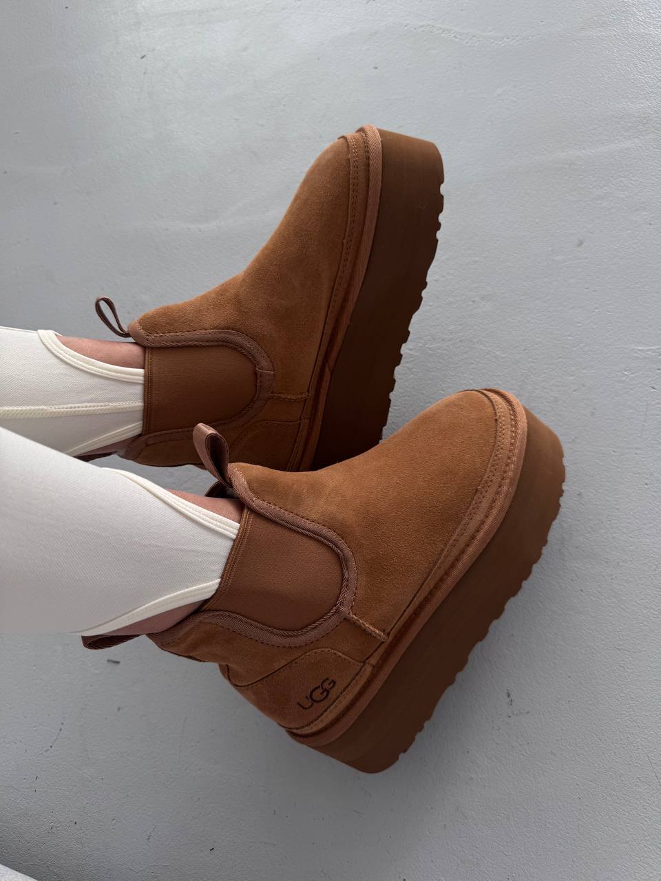 UGG Chelsea Mini Platform Chestnut — стильні замшеві черевики з еластичними вставками та піднятою платформою для комфорту й сучасного вигляду.