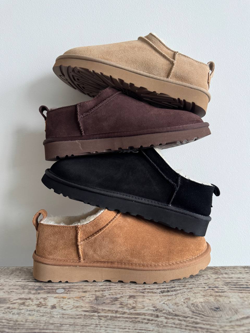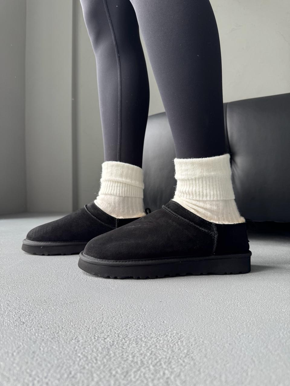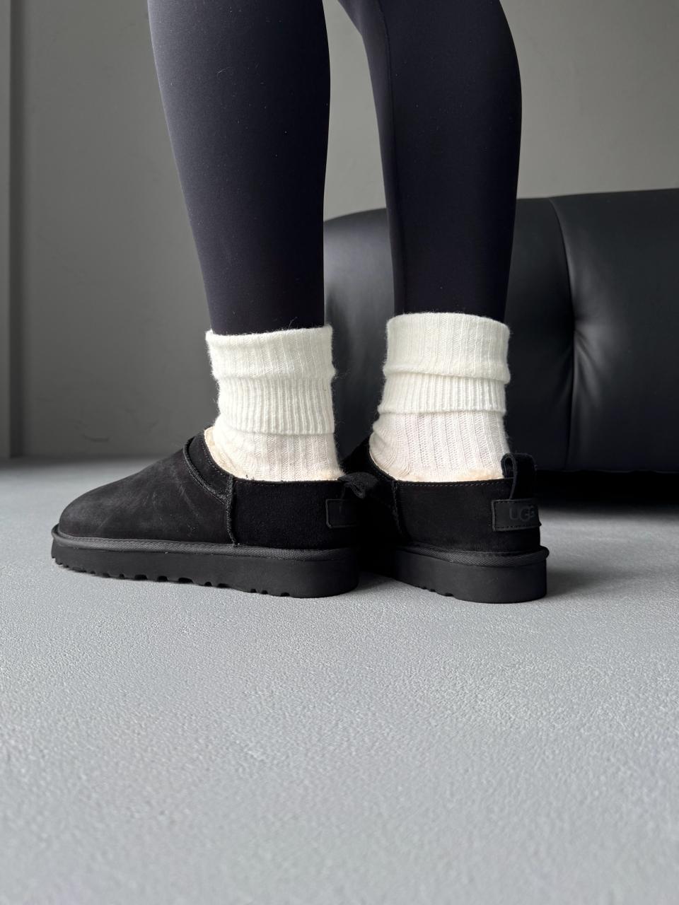 UGG Classic Micro Boot Black — це ультранизькі чорні замшеві чоботи з м’яким овечим хутром всередині та легкою амортизуючою підошвою.