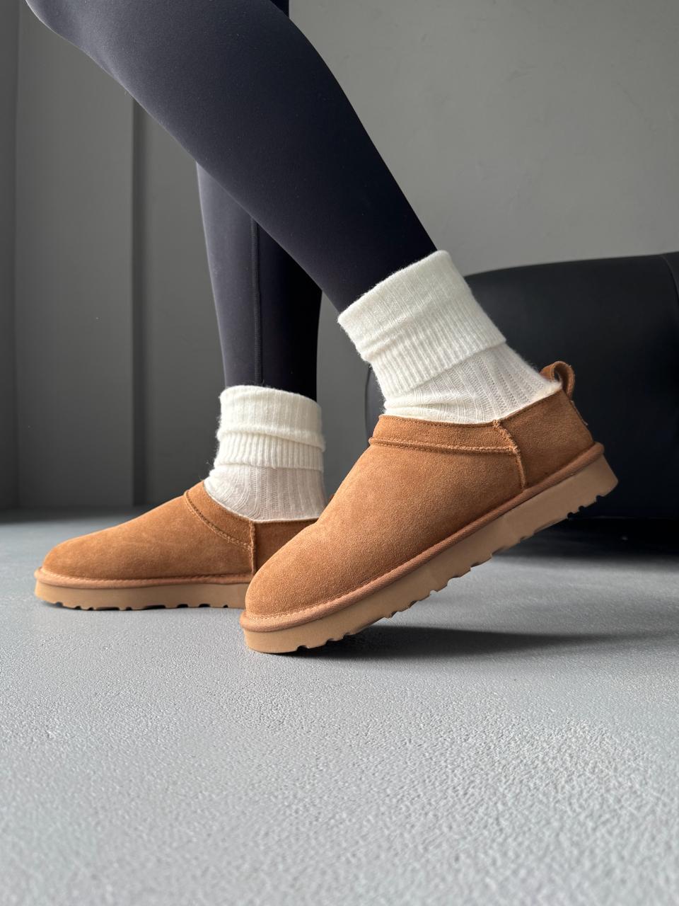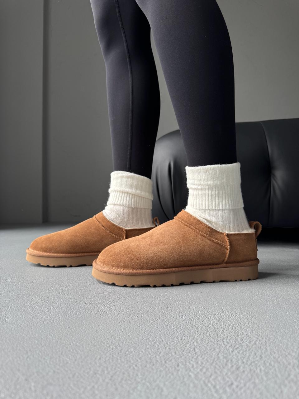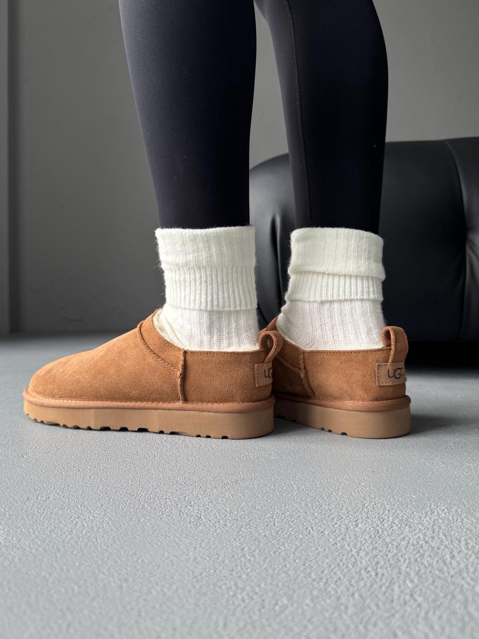 UGG Classic Micro Boot Chestnut — це ультранизькі замшеві чоботи в теплому каштановому кольорі з м’яким хутром усередині та легкою підошвою.