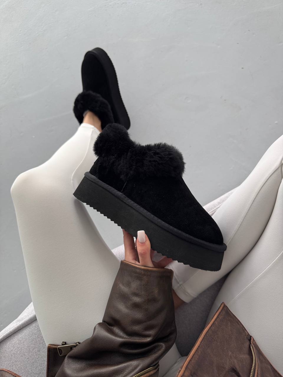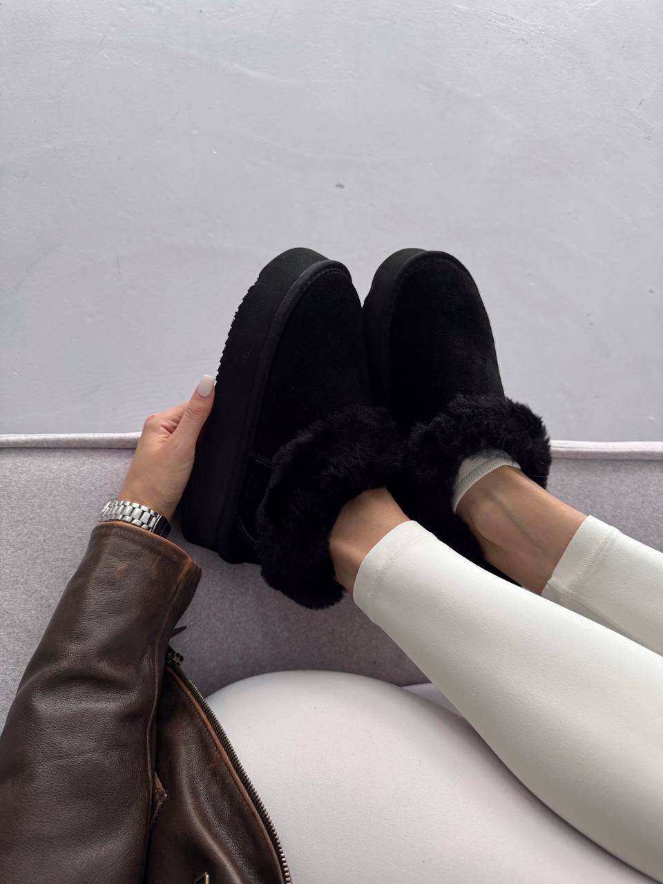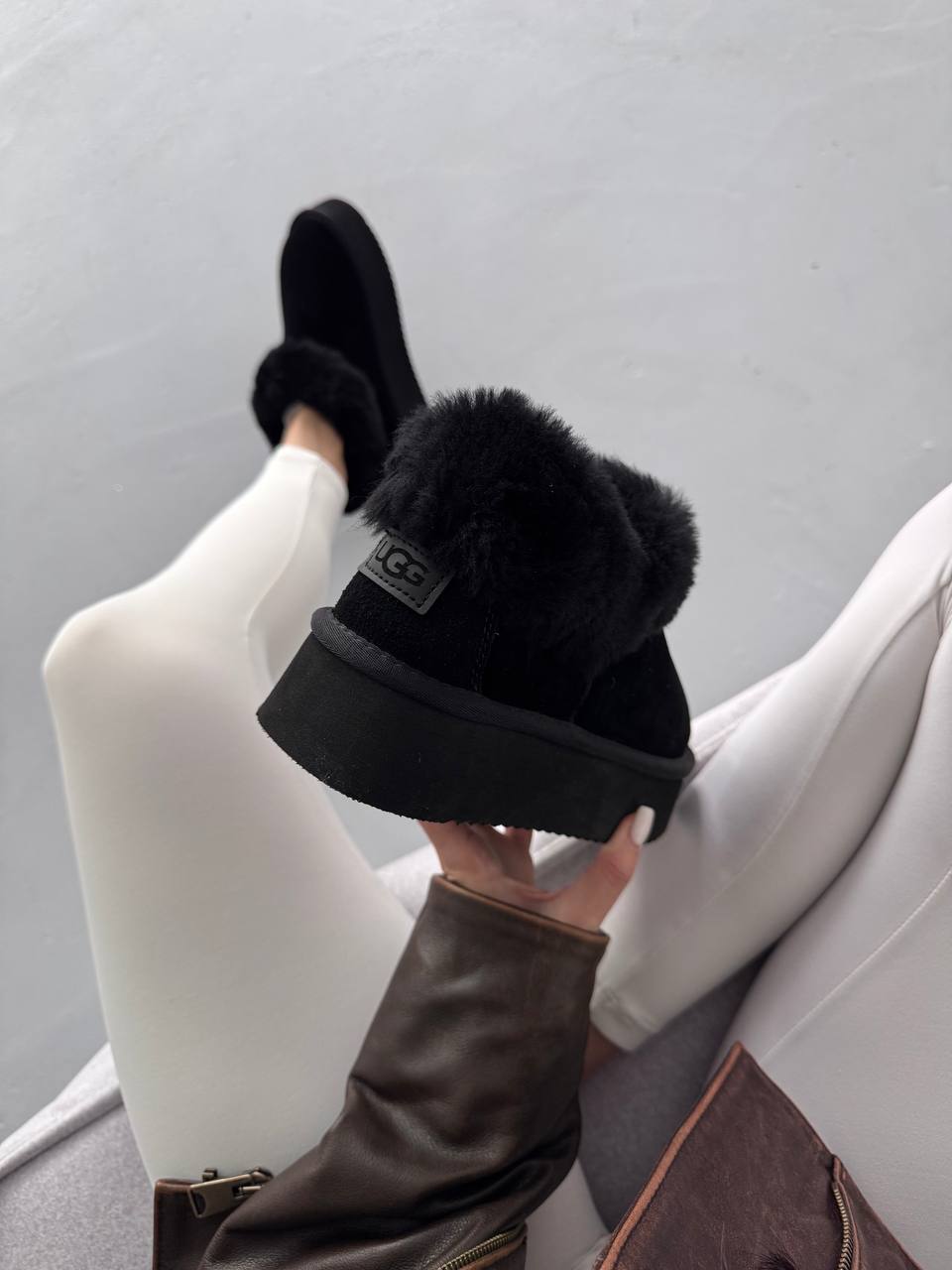 Ugg Fur Slippers Black Suede — м’які та теплі капці з натуральної замші й пухнастим хутром усередині, забезпечують комфорт і затишок у будь-яку пору року.