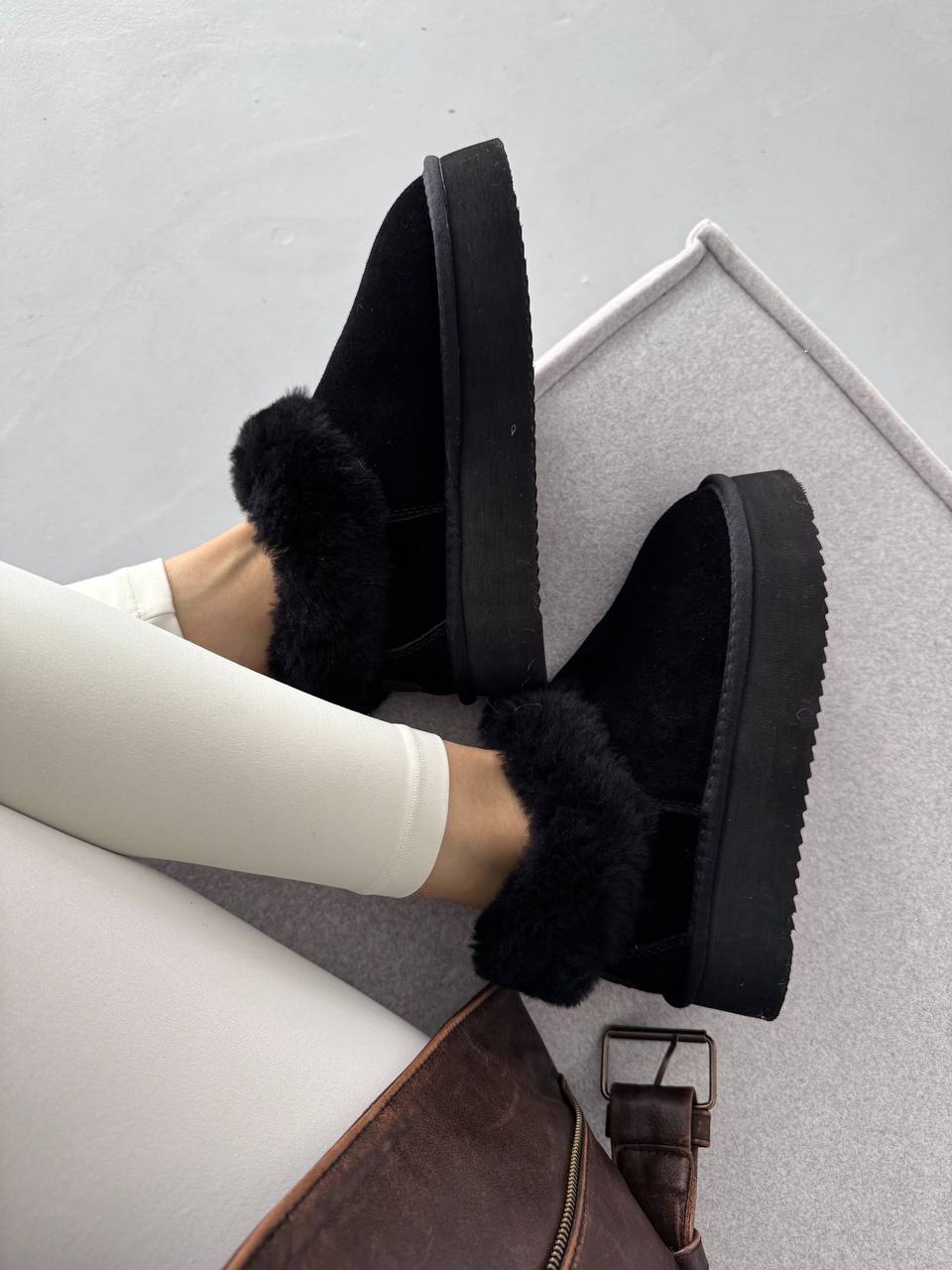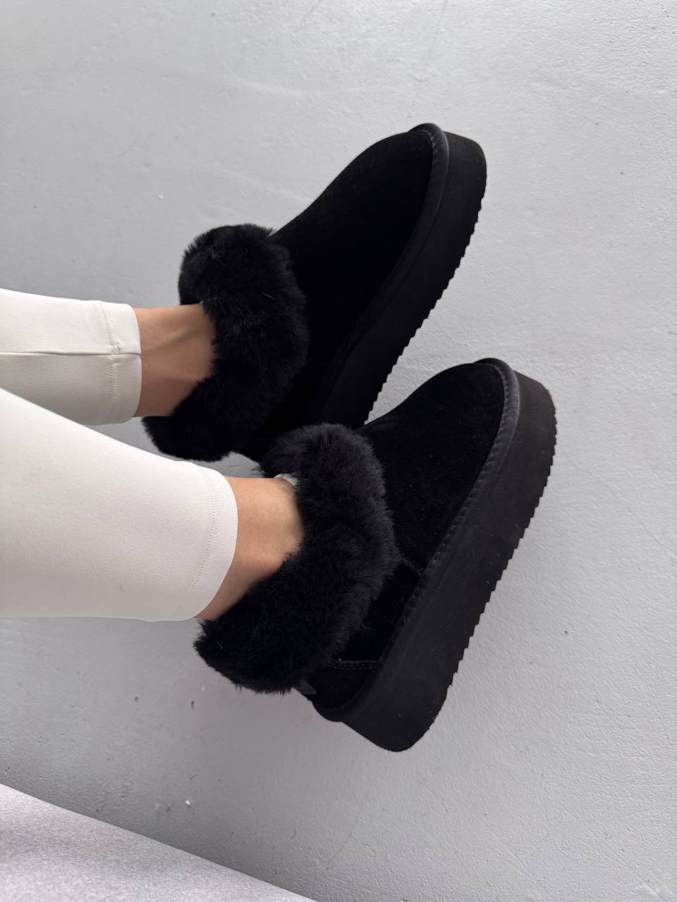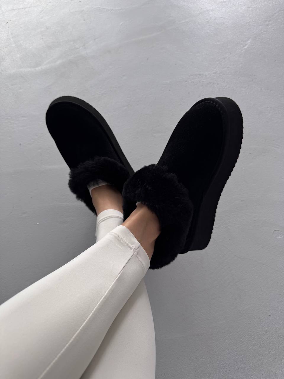 Ugg Fur Slippers Black Suede — м’які та теплі капці з натуральної замші й пухнастим хутром усередині, забезпечують комфорт і затишок у будь-яку пору року.