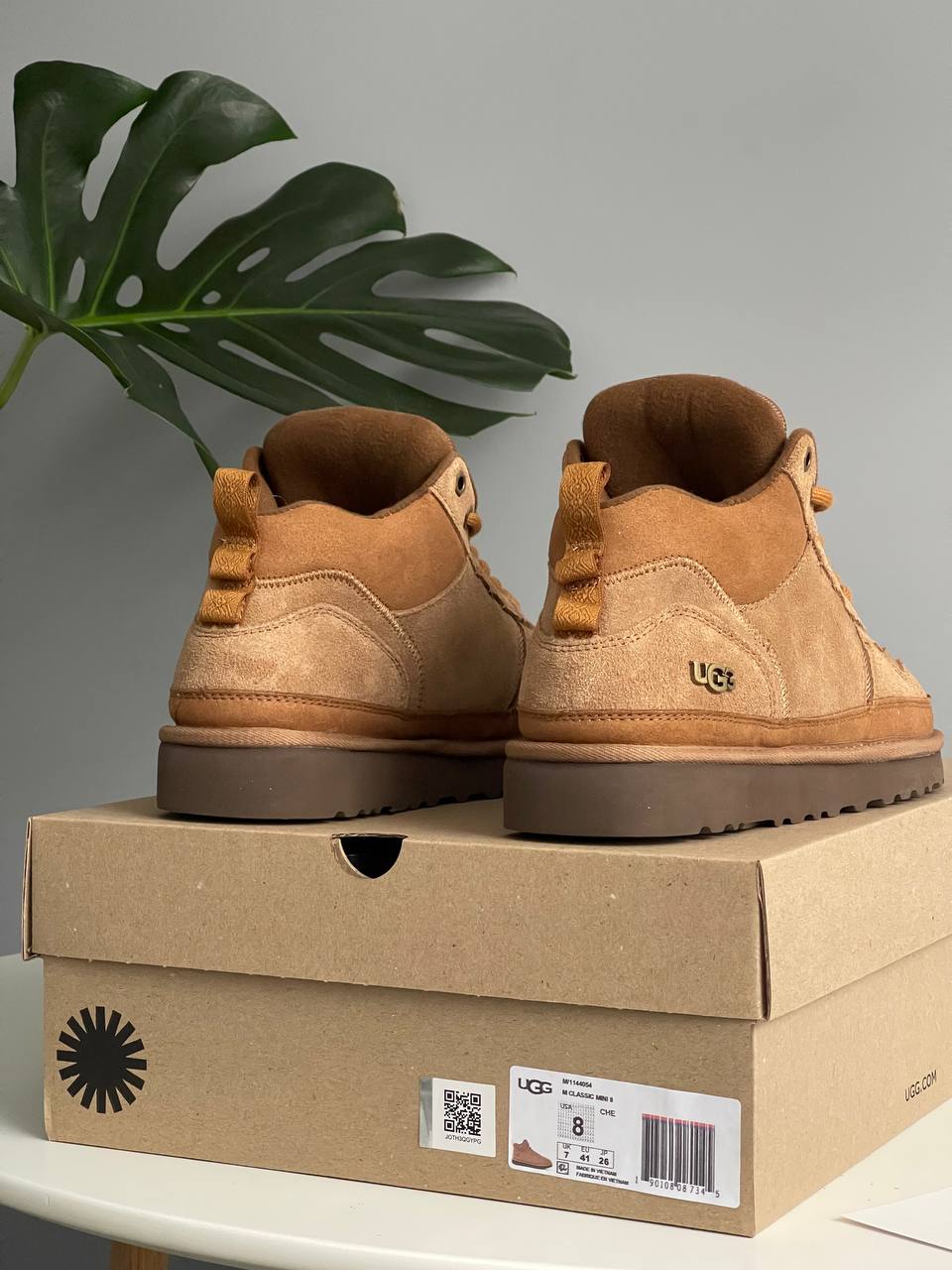 UGG Highland Hi Heritage Chestnut — це високі чоботи з натуральної замші в теплом каштановому відтінку з м’яким овечим хутром усередині та масивною підошвою для комфорту й стилю.