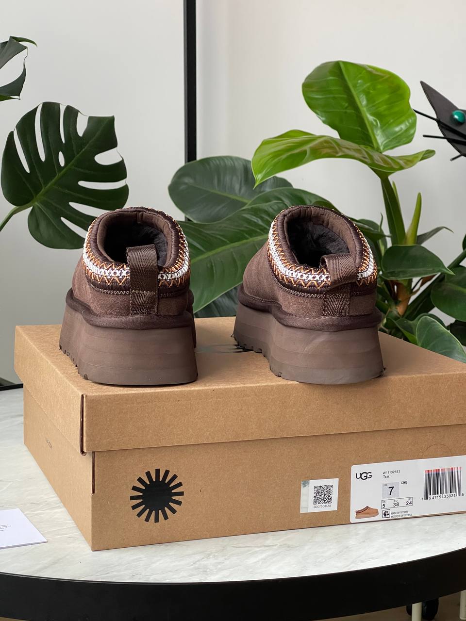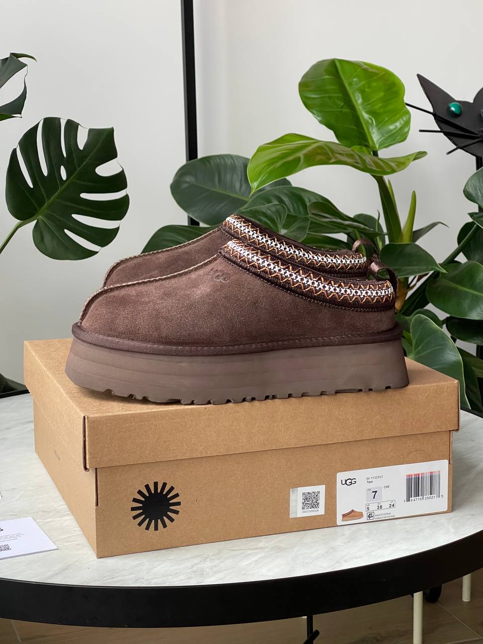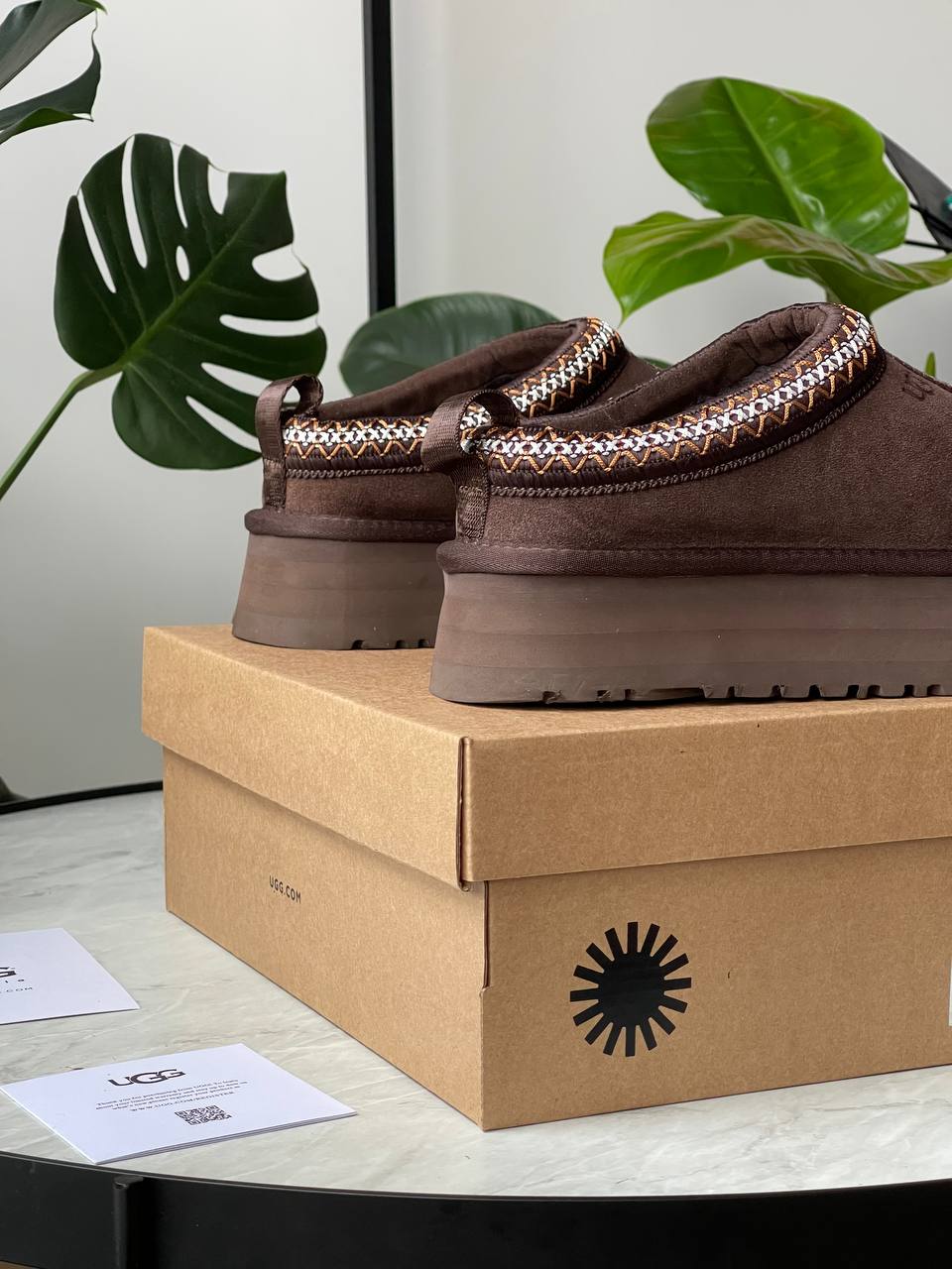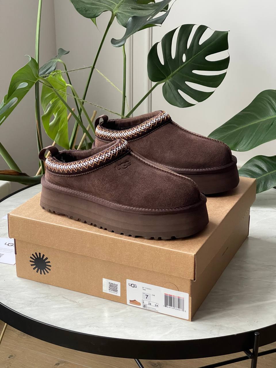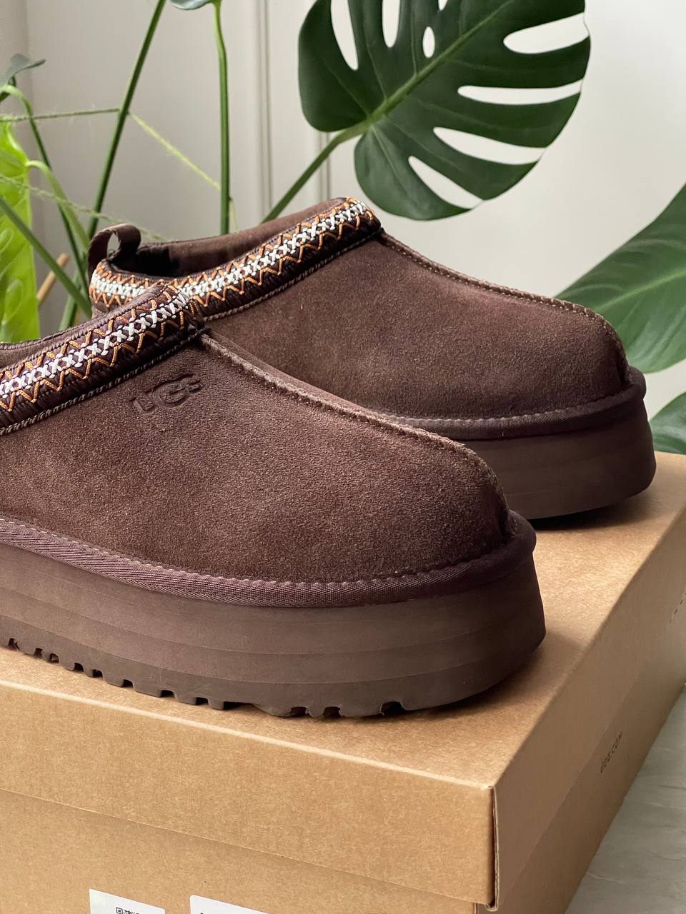 UGG Tasman Platform Brown — елегантні чоботи на платформі з натурального замшу коричневого кольору. Вони мають м'яку підкладку з овечого хутра, що забезпечує комфорт і тепло, а також легку, але міцну підошву, яка додає висоти і забезпечує стабільність при ходьбі.