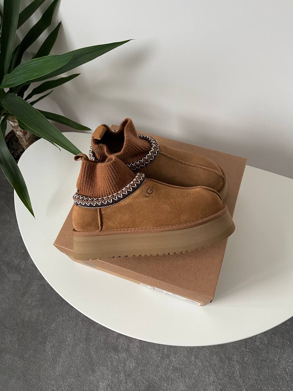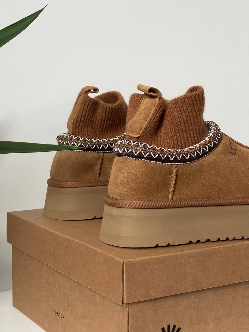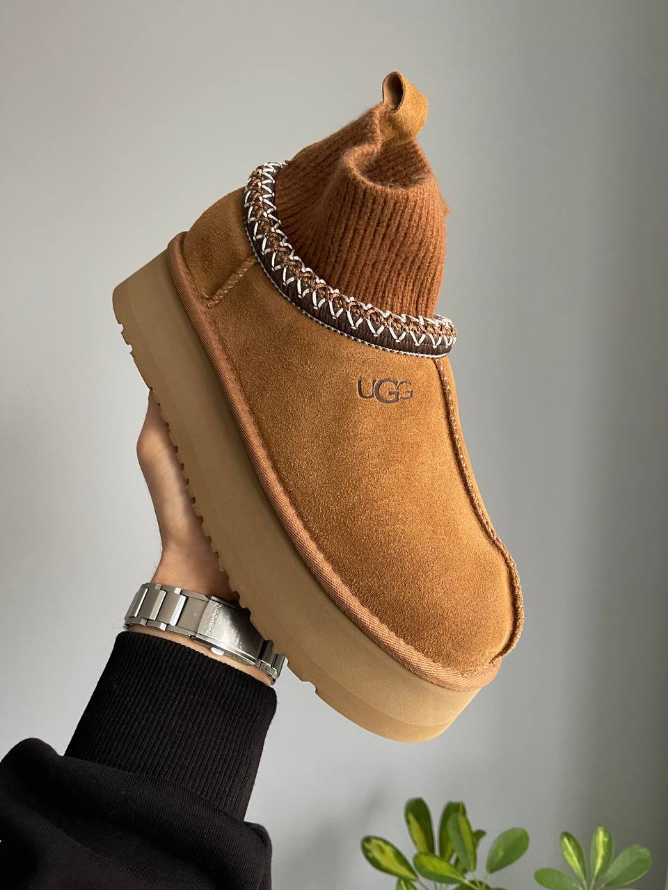 Ugg Tasman Platform Sock Chestnut сучасна інтерпретація класичних сабо UGG. Замшевий верх у відтінку каштан поєднано з м’якою внутрішньою підкладкою з овчини та високою платформою. Трикотажна манжета додає оригінальності та затишку, роблячи модель зручною для щоденного носіння.