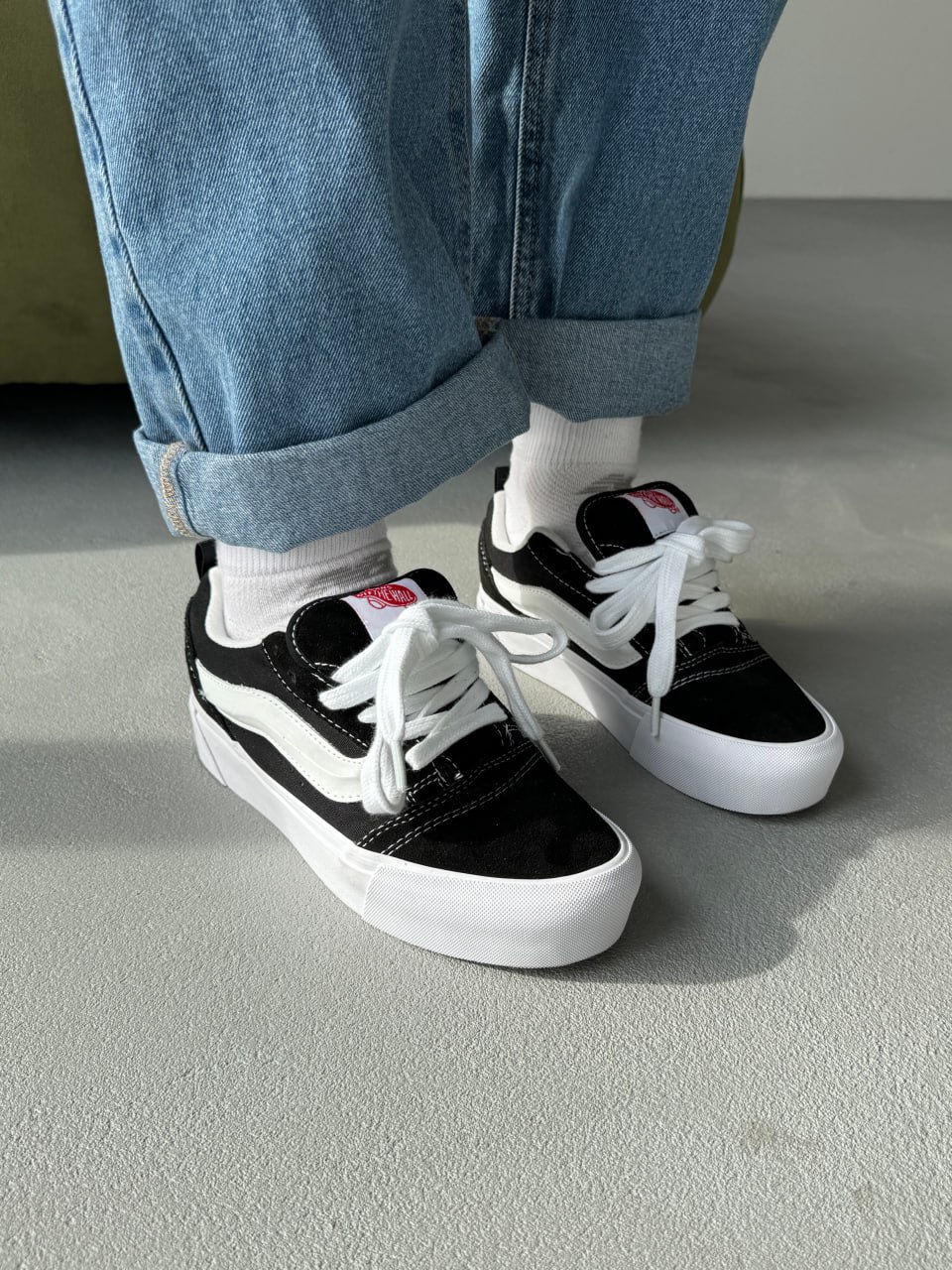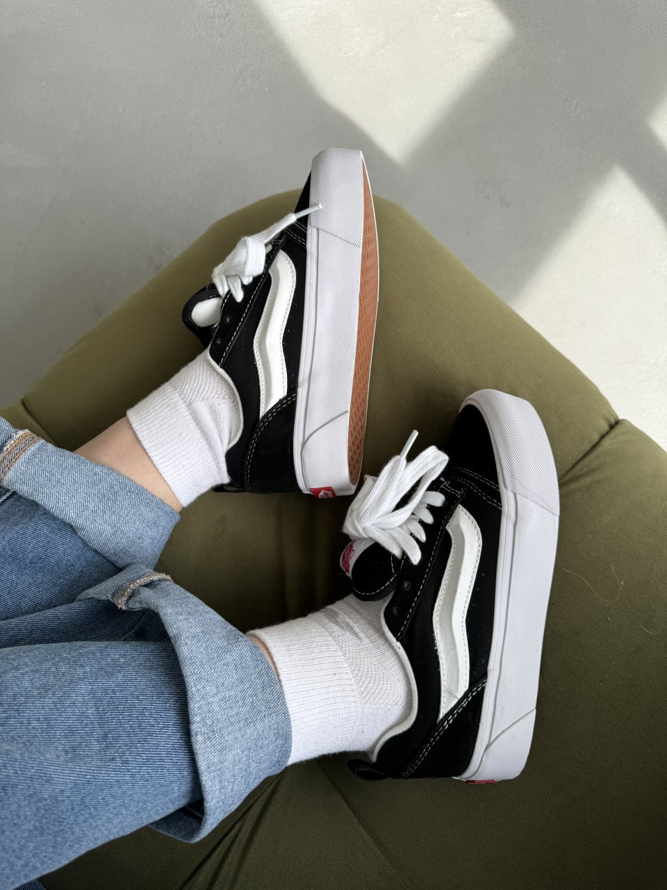 Vans Knu Skool Platform Black/White — Стильні кеди з підошвою-платформою, міцним верхом із замші та текстилю, фірмовою смугою збоку і гумовою підошвою